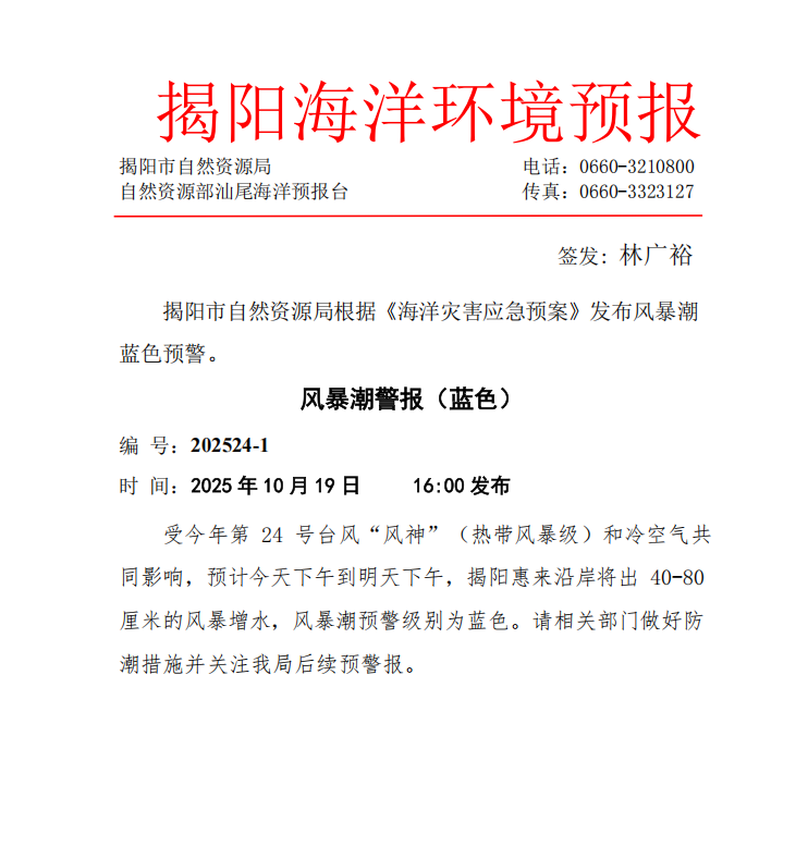 风暴潮警报(蓝色) 2025年10月19日 16:00