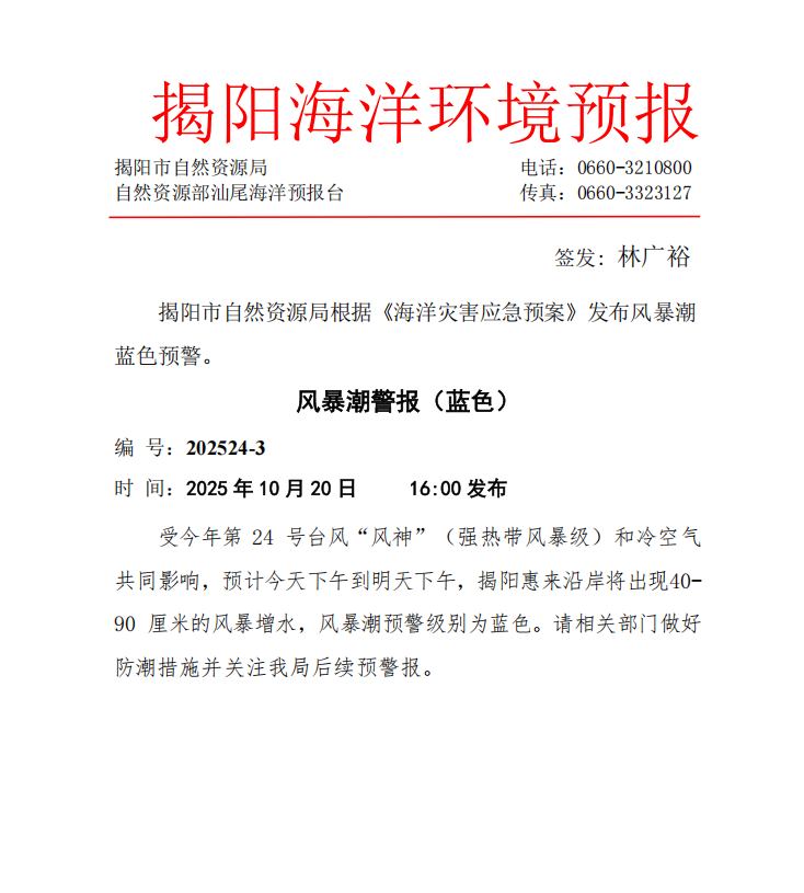 风暴潮警报(蓝色) 2025年10月20日 16:00