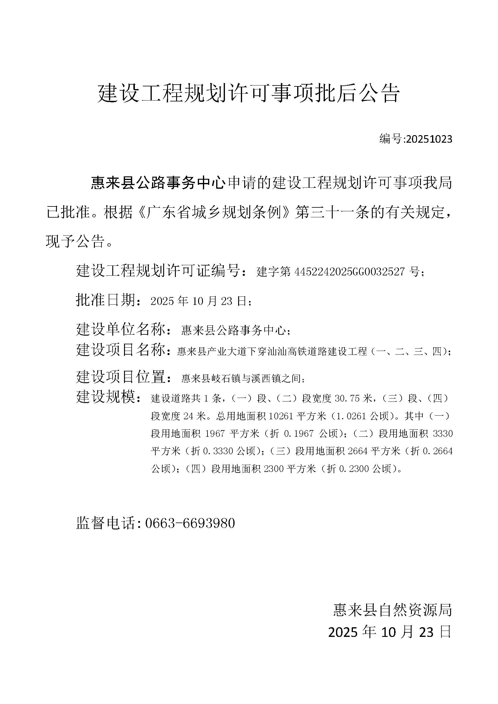 惠来县产业大道下穿汕汕高铁道路建设工程(一、二、三、四)建设工程规划许可证申请批后公告