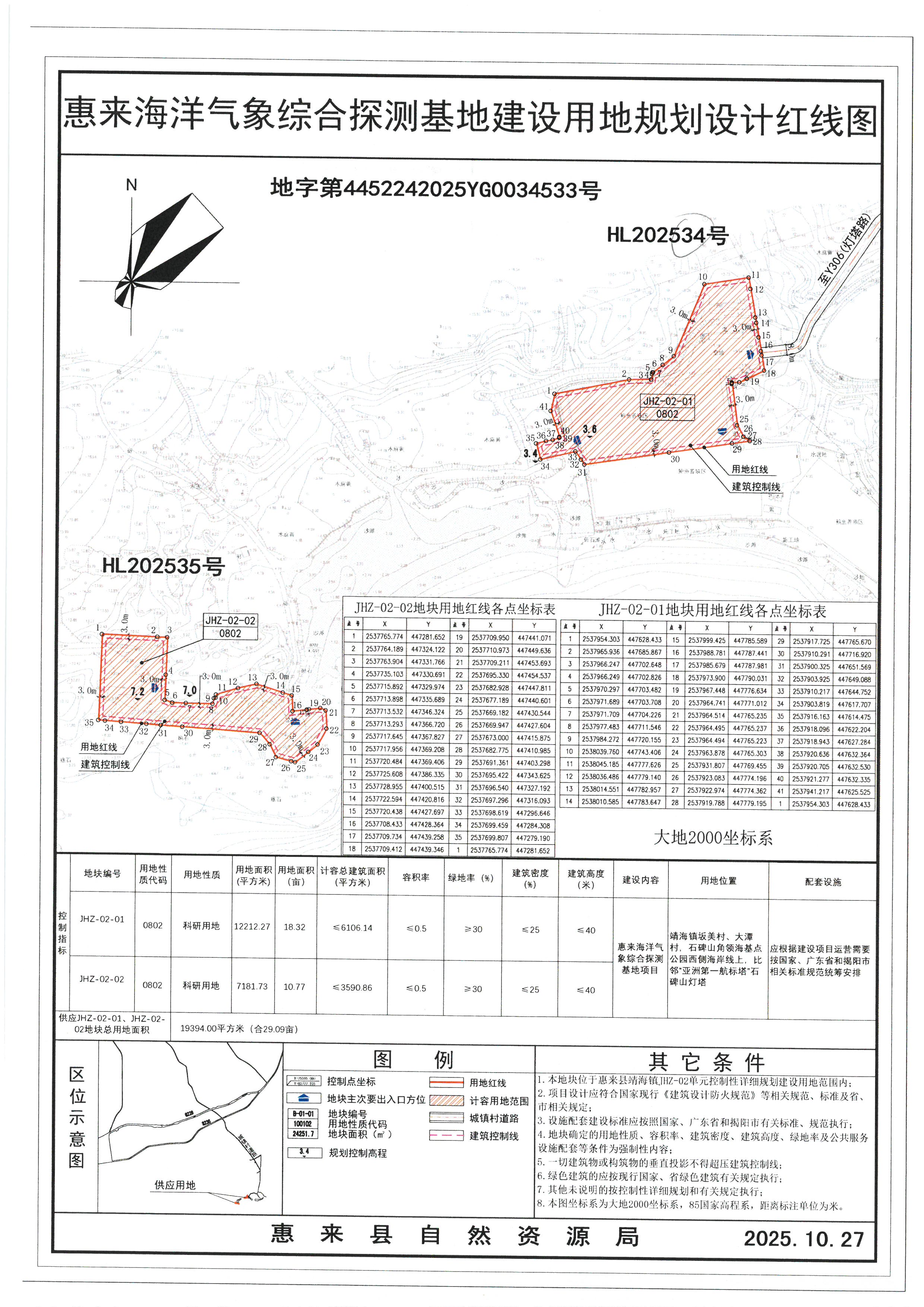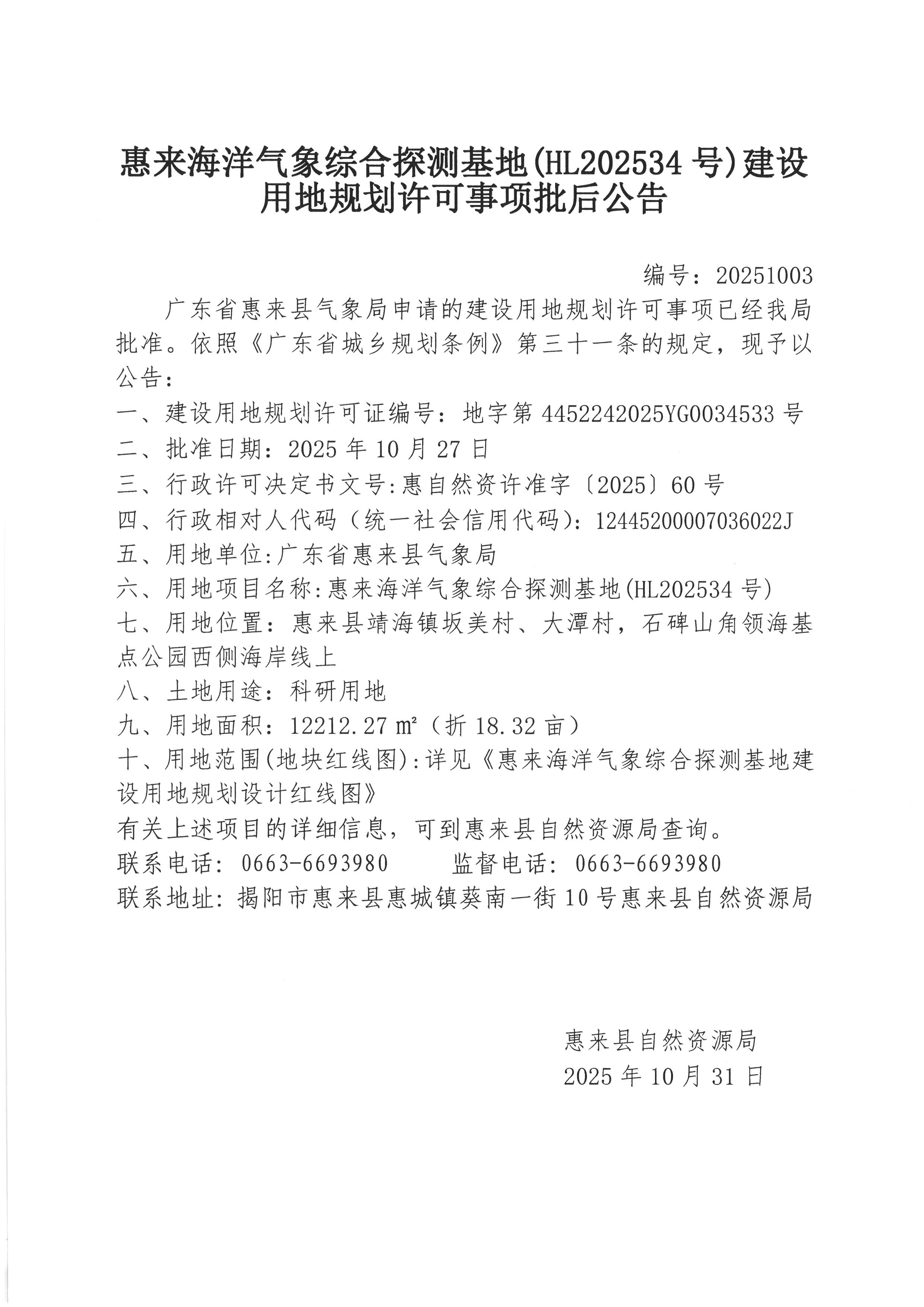 惠来海洋气象综合探测基地(HL202534号)建设用地规划许可事项批后公告