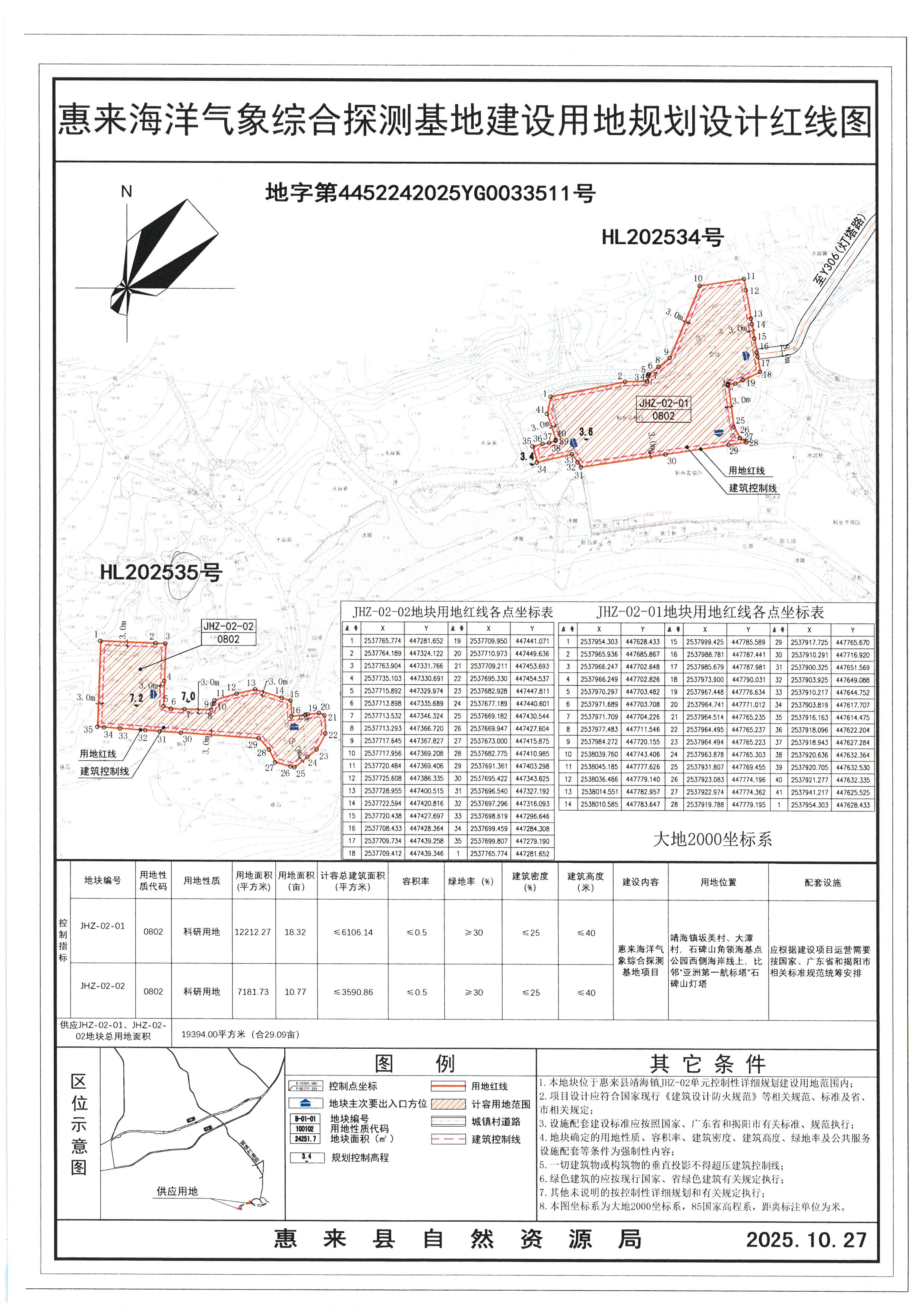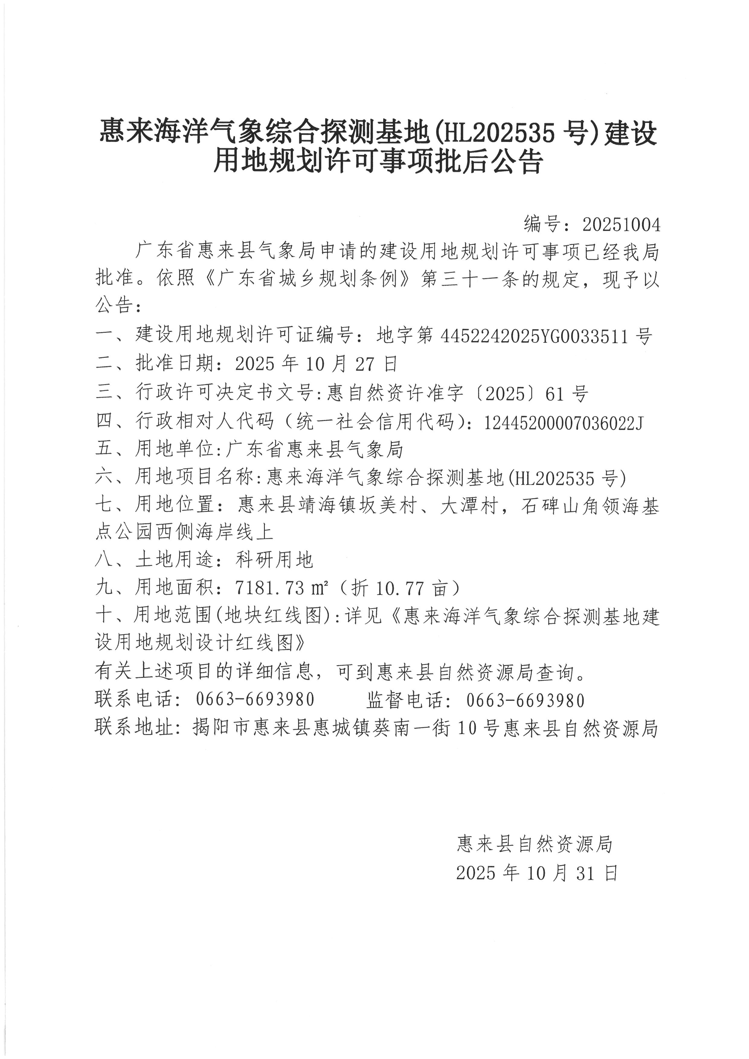 惠来海洋气象综合探测基地(HL202535号)建设用地规划许可事项批后公告