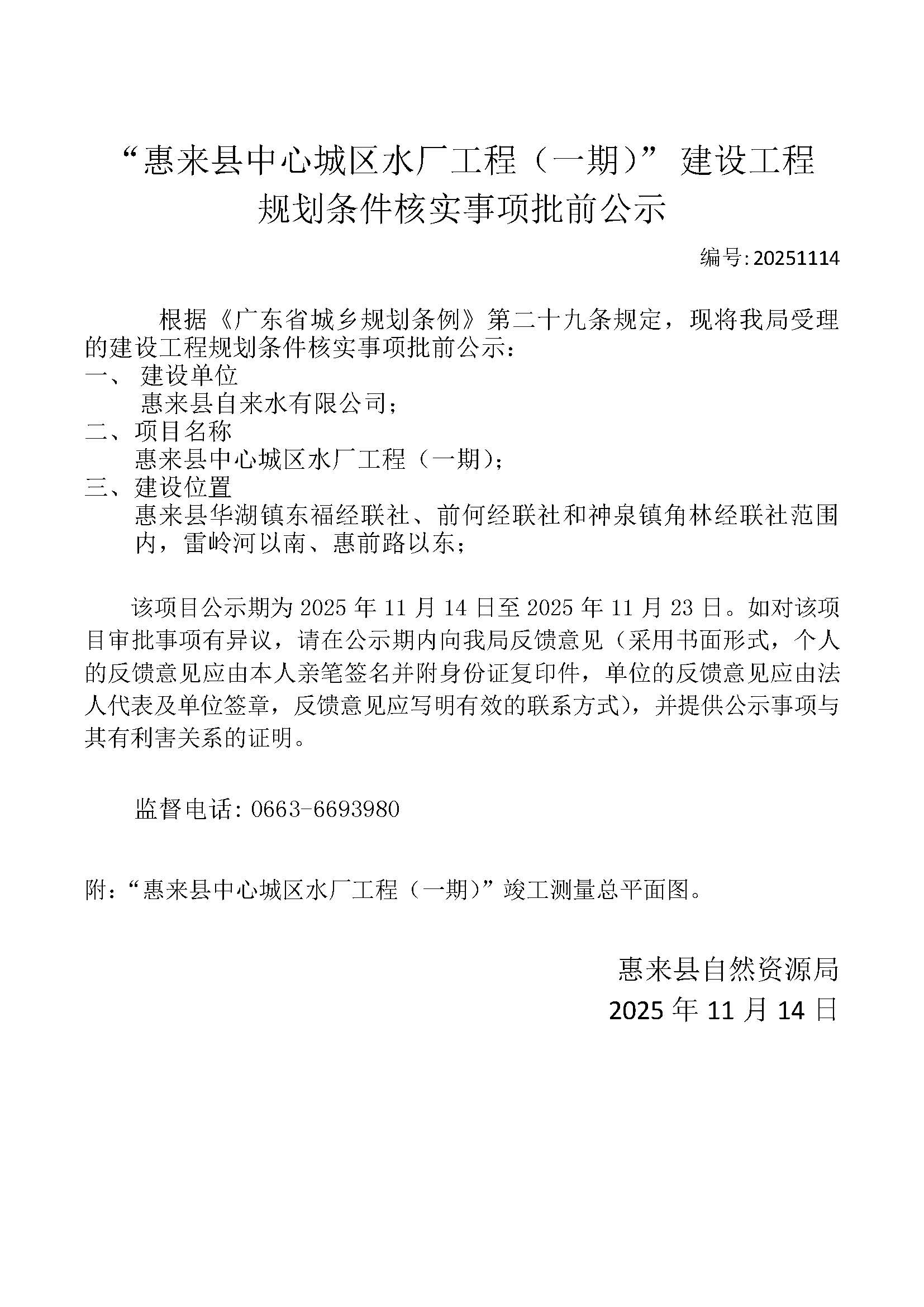 惠来县中心城区水厂工程(一期)建设工程规划条件核实批前公示