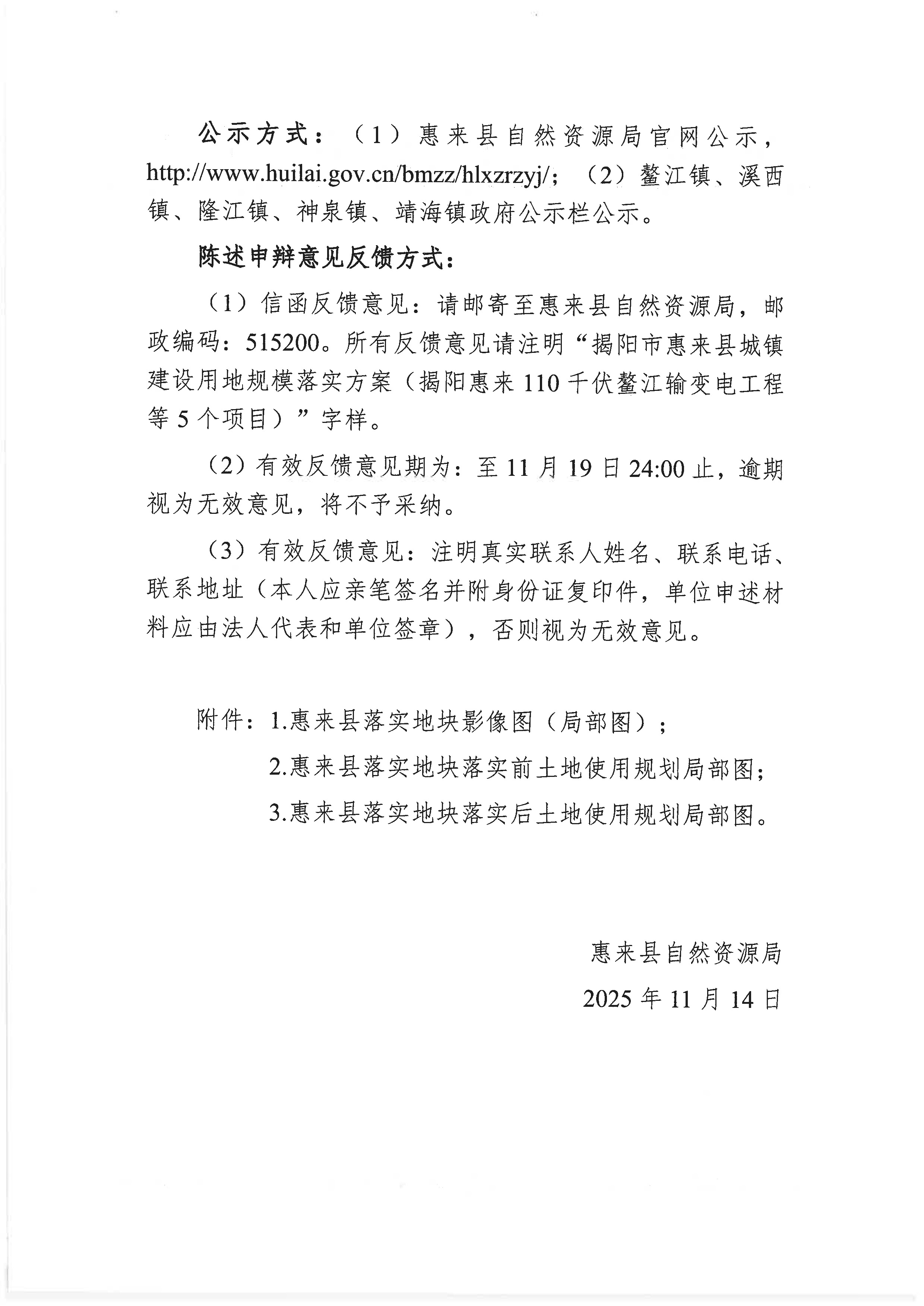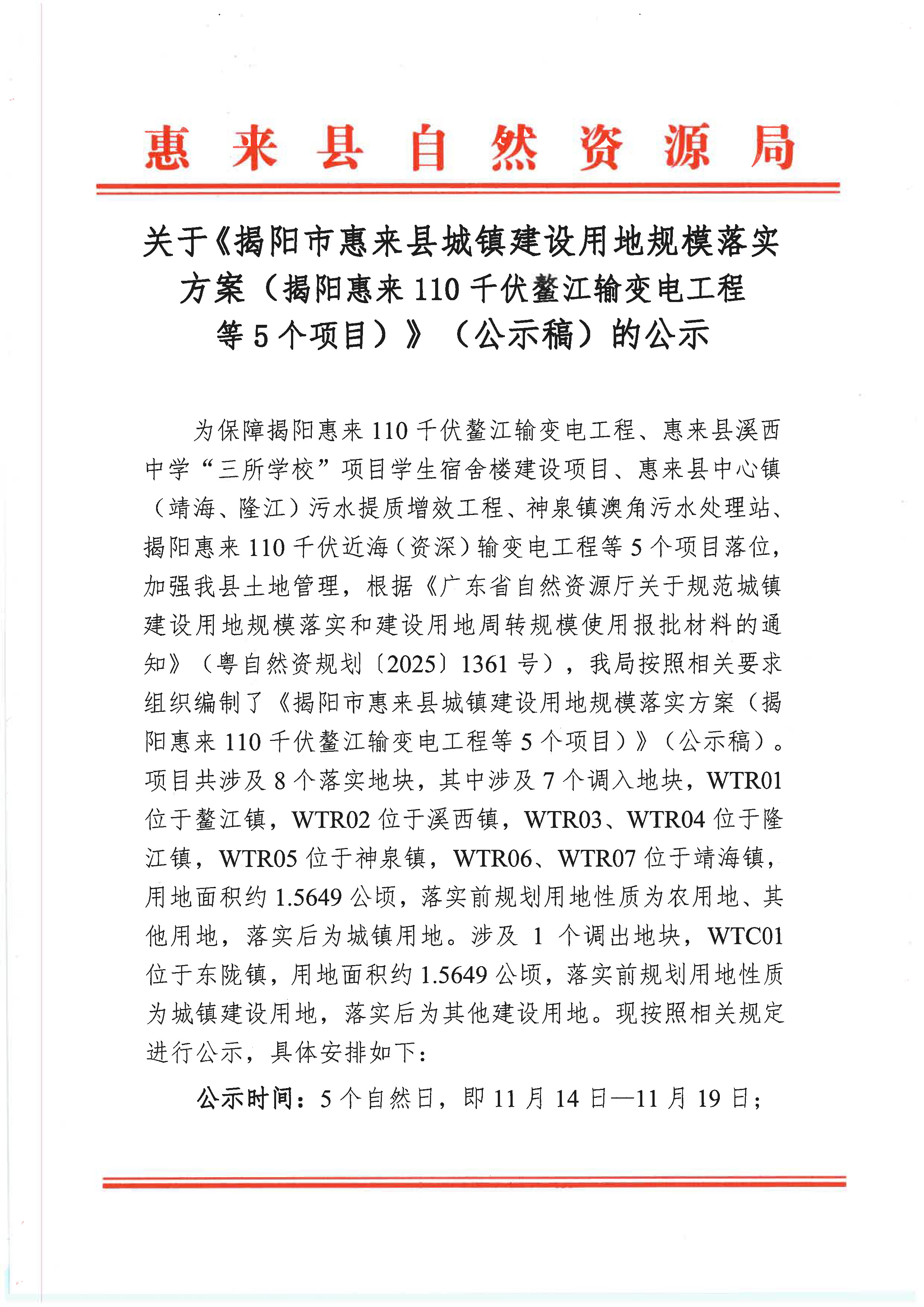 关于《揭阳市惠来县城镇建设用地规模落实方案(揭阳惠来110千伏鳌江输变电工程等5个项目)》(公示稿)的公示