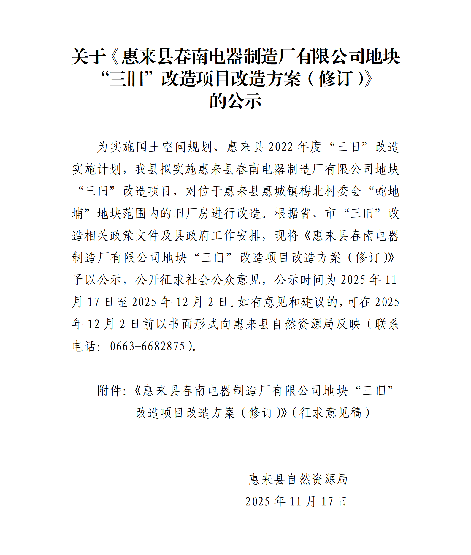 关于《惠来县春南电器制造厂有限公司地块“三旧”改造项目改造方案(修订)》的公示