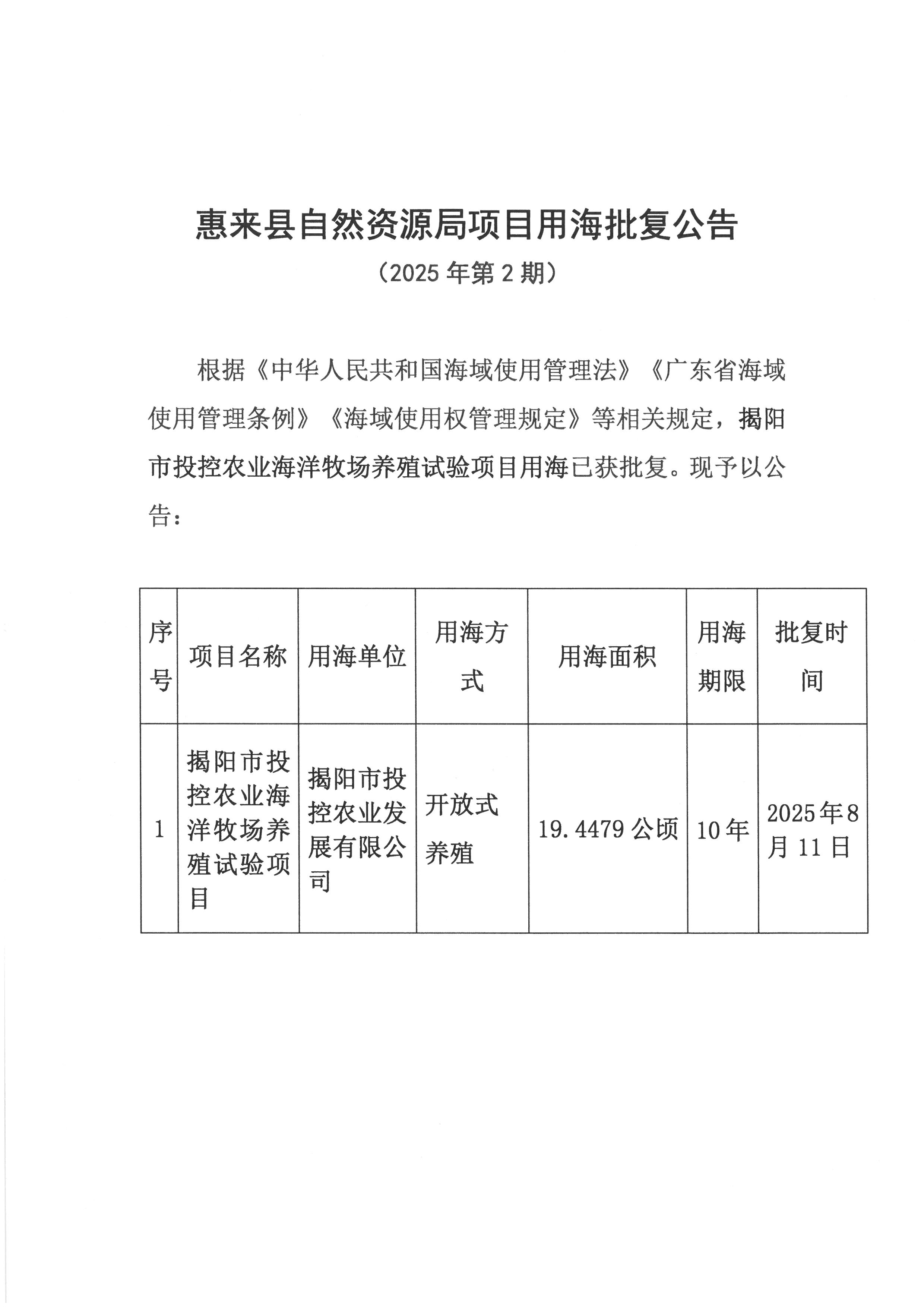 惠来县自然资源局项目用海批复公告(2025年第2期)