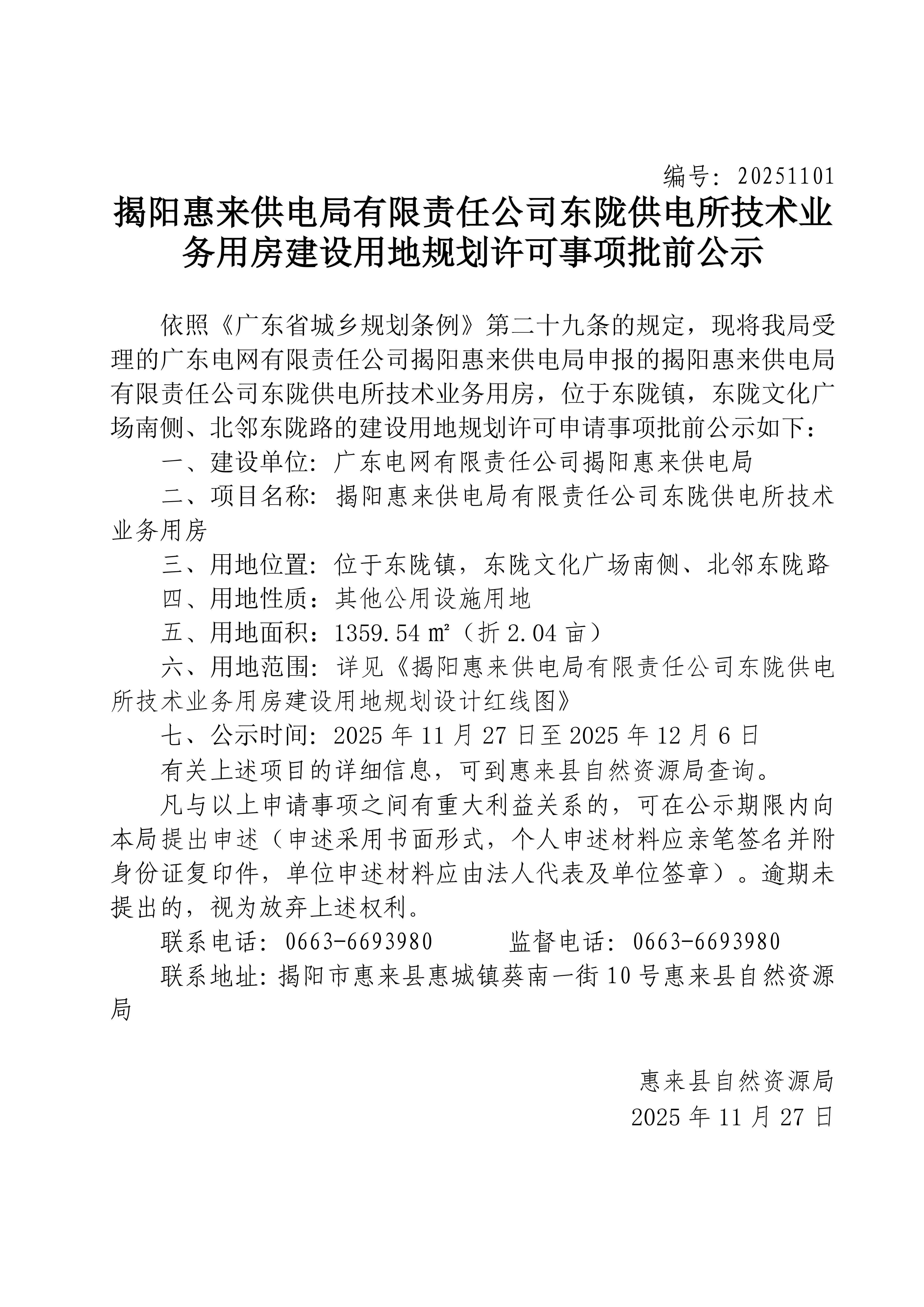 揭阳惠来供电局有限责任公司东陇供电所技术业务用房建设用地规划许可事项批前公示