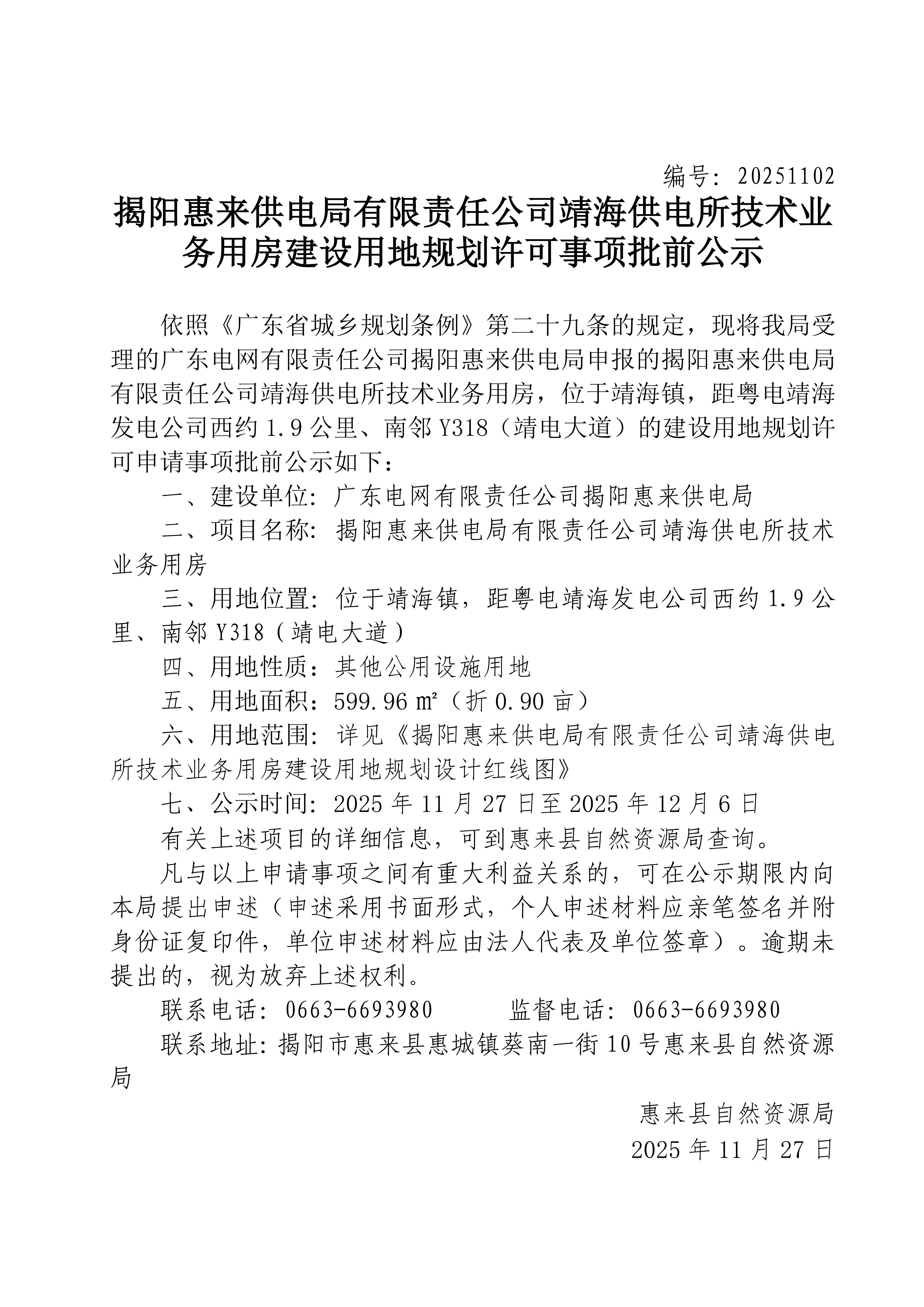 揭阳惠来供电局有限责任公司靖海供电所技术业务用房建设用地规划许可事项批前公示