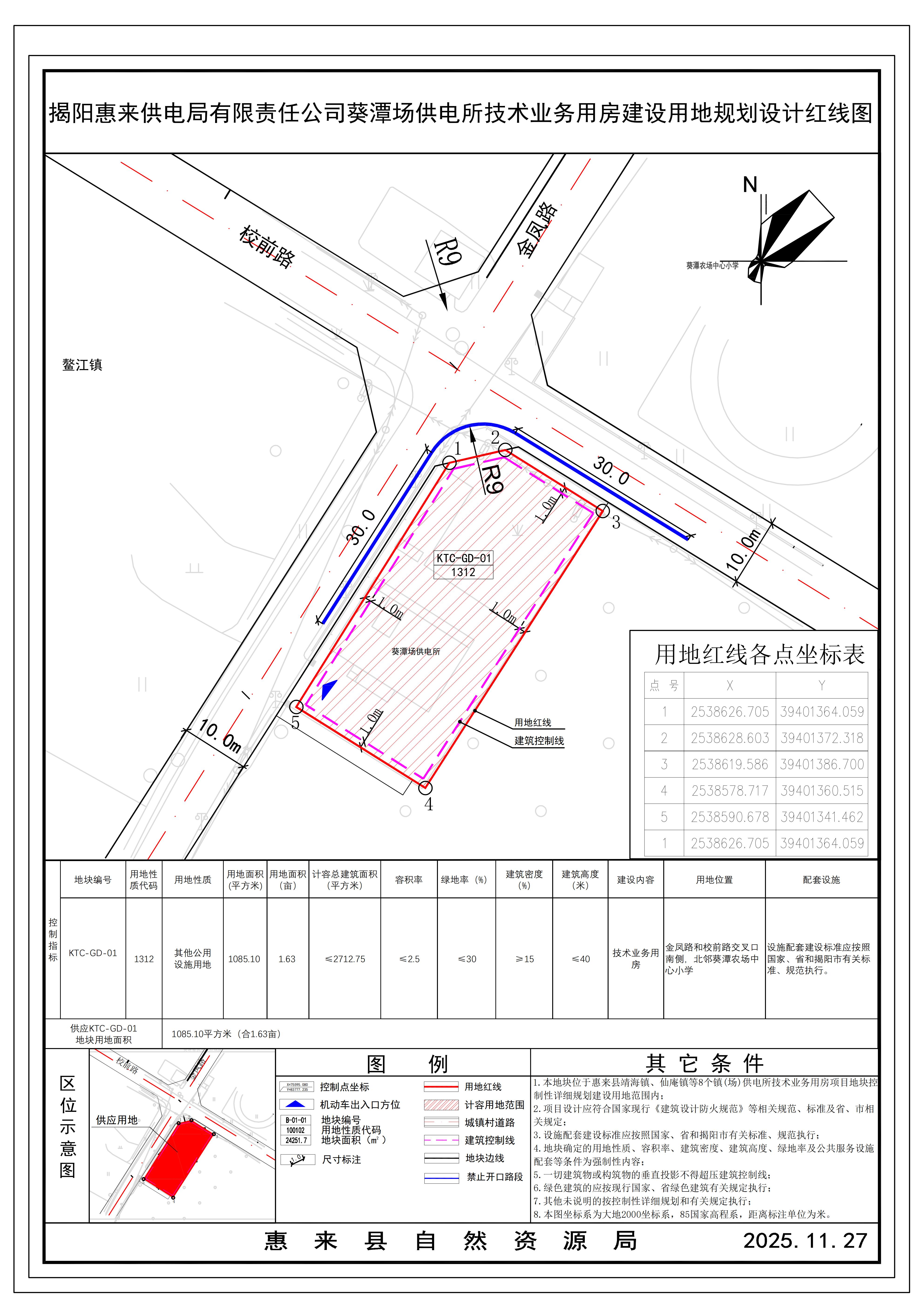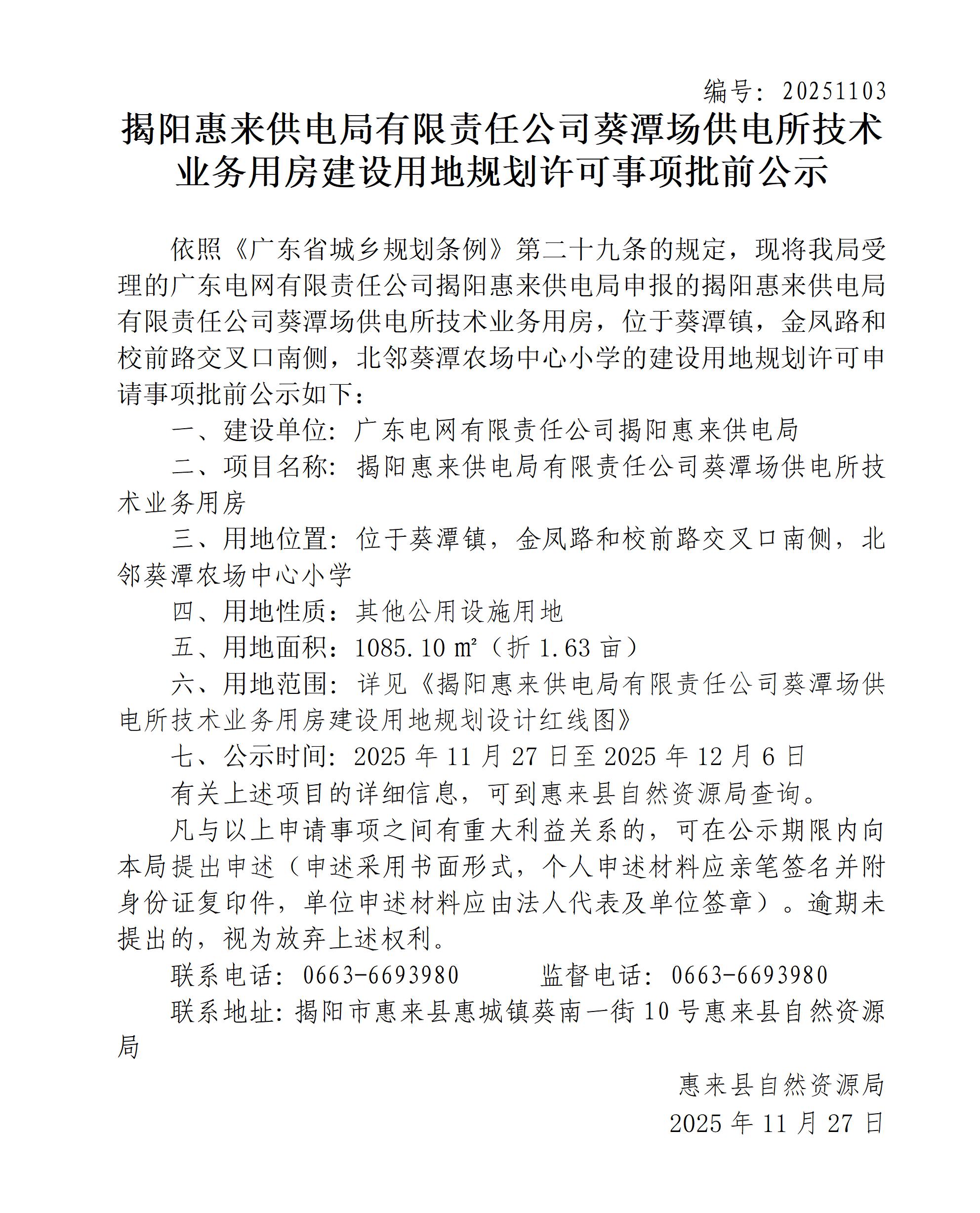 揭阳惠来供电局有限责任公司葵潭场供电所技术业务用房建设用地规划许可事项批前公示