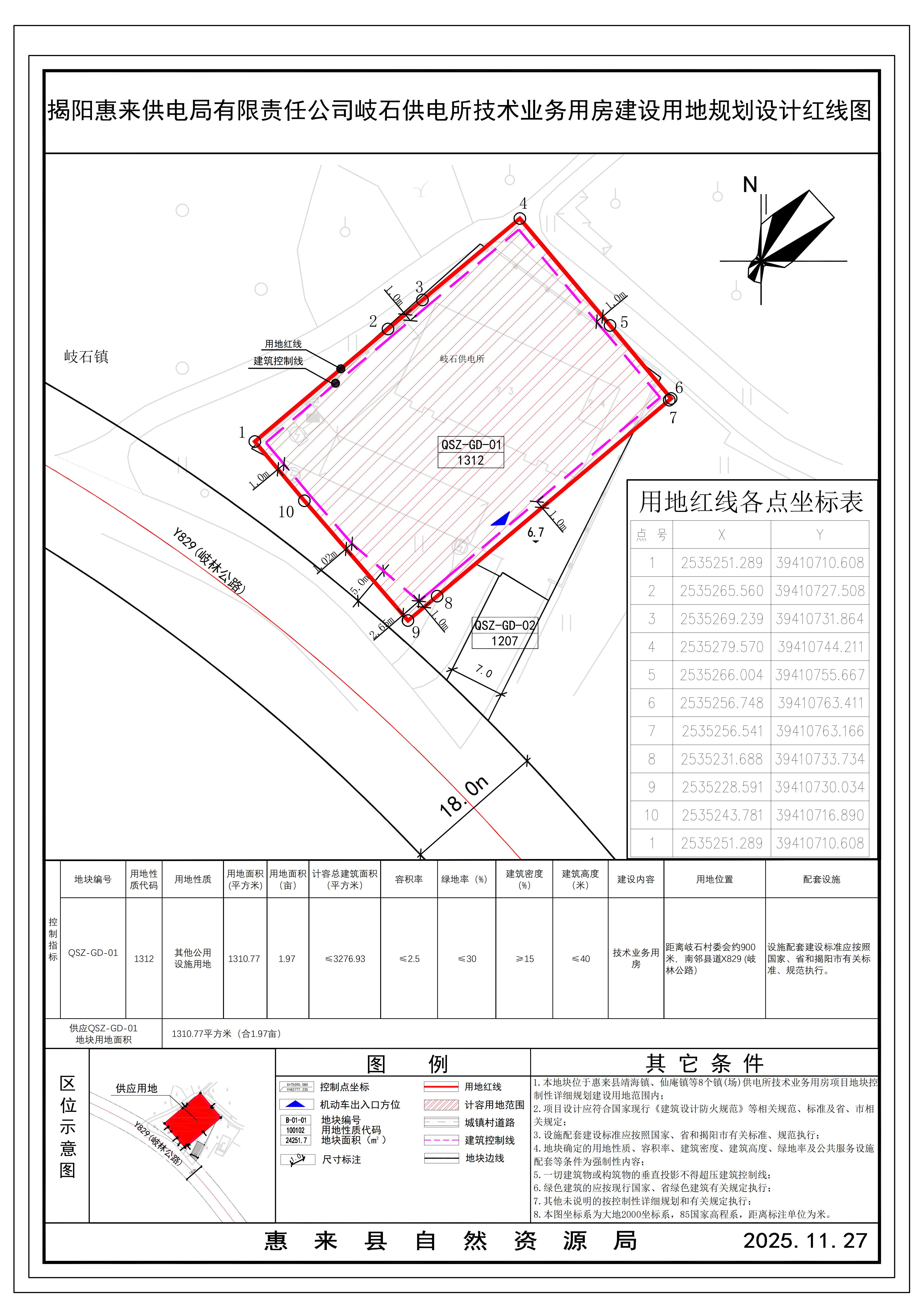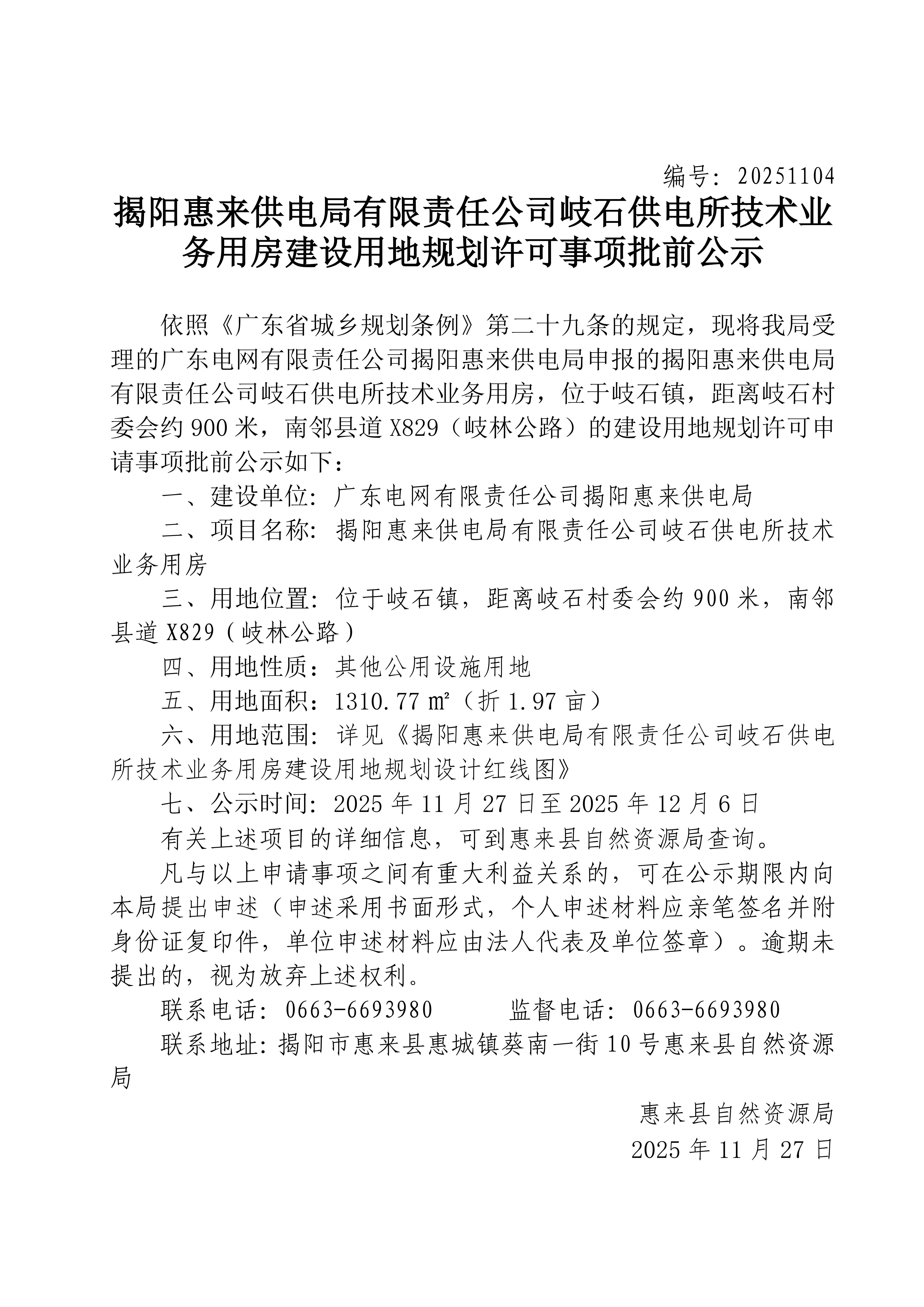 揭阳惠来供电局有限责任公司岐石供电所技术业务用房建设用地规划许可事项批前公示