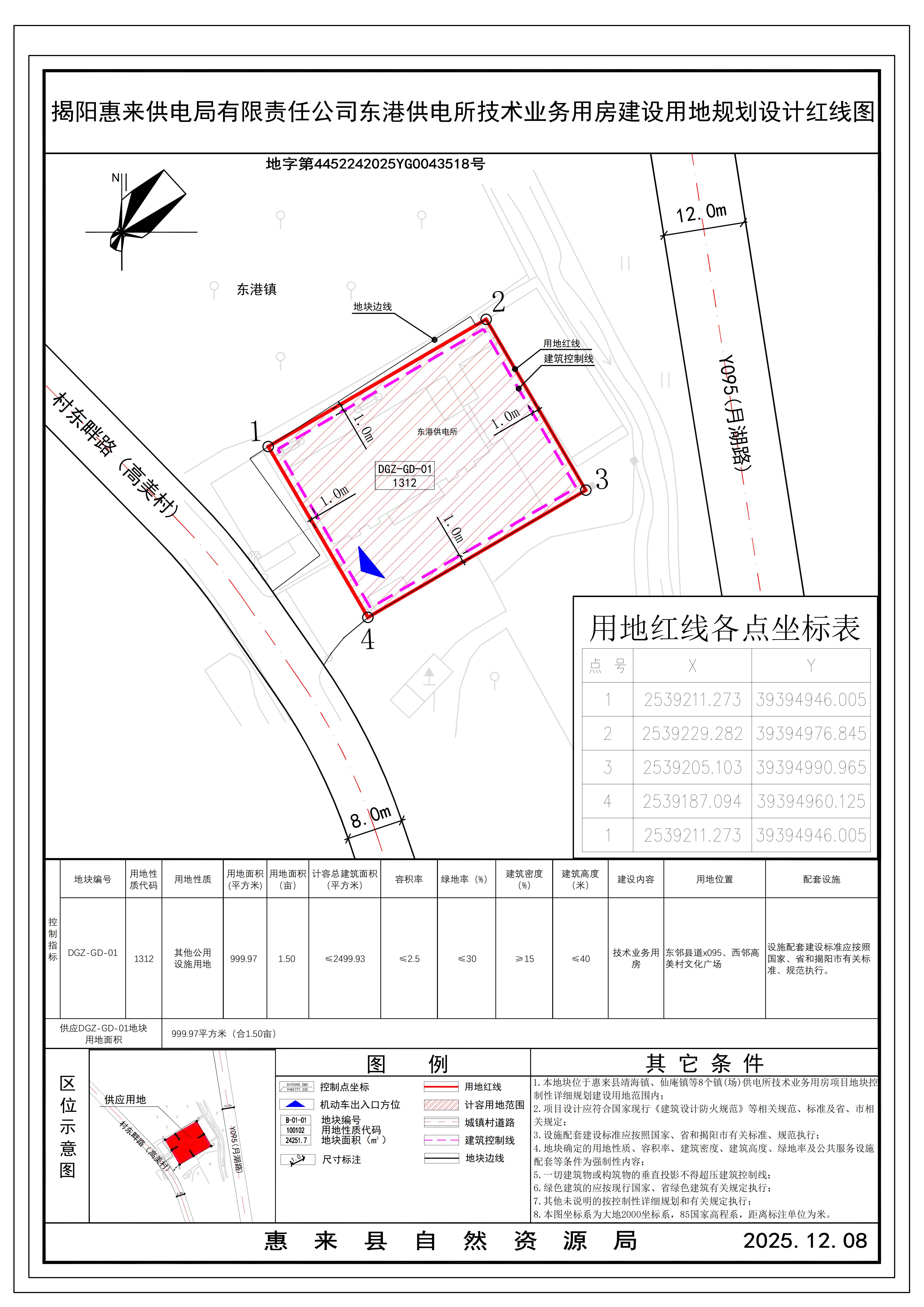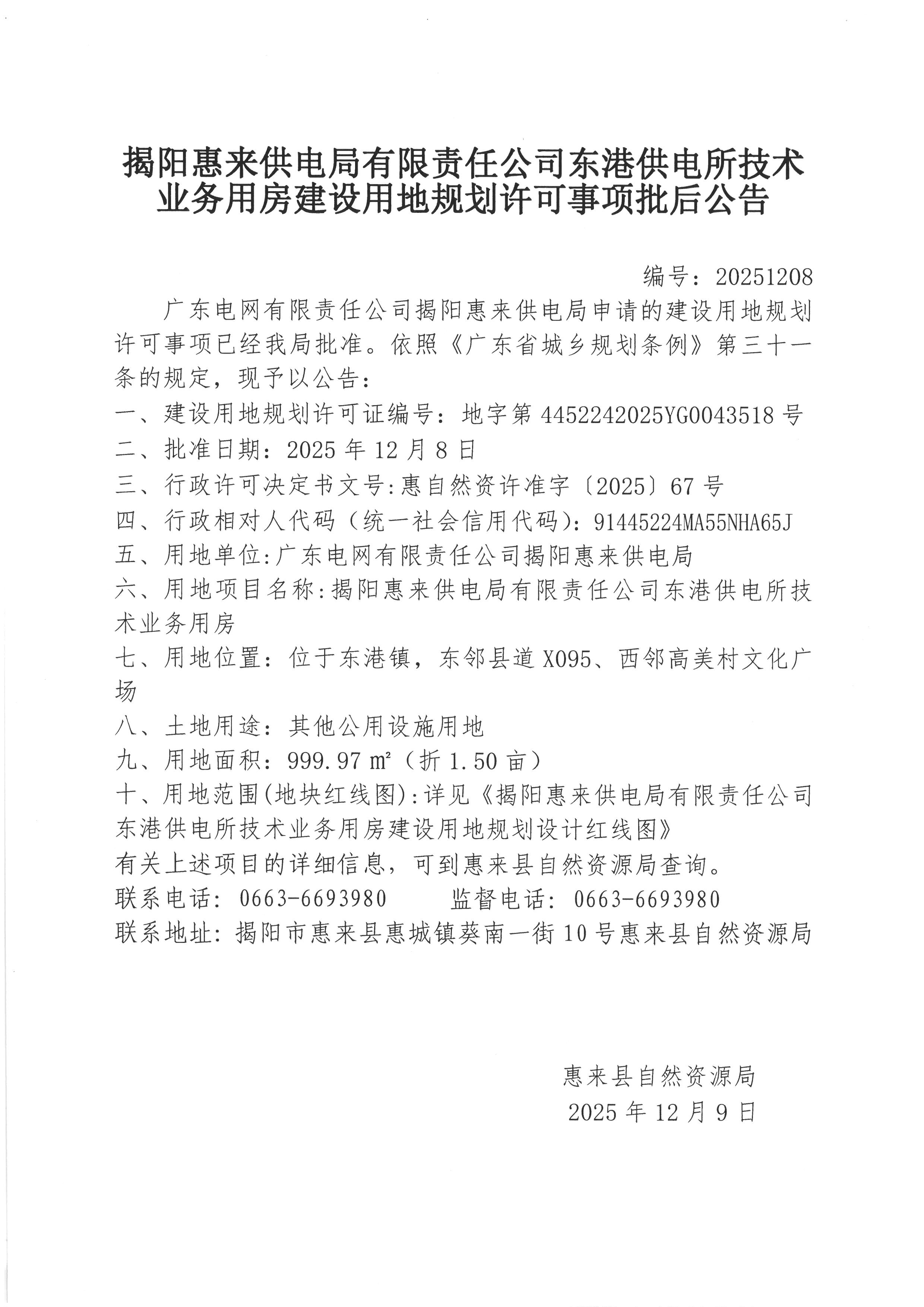 揭阳市惠来供电局有限责任公司东港供电所技术业务用房建设用地规划许可事项批后公告