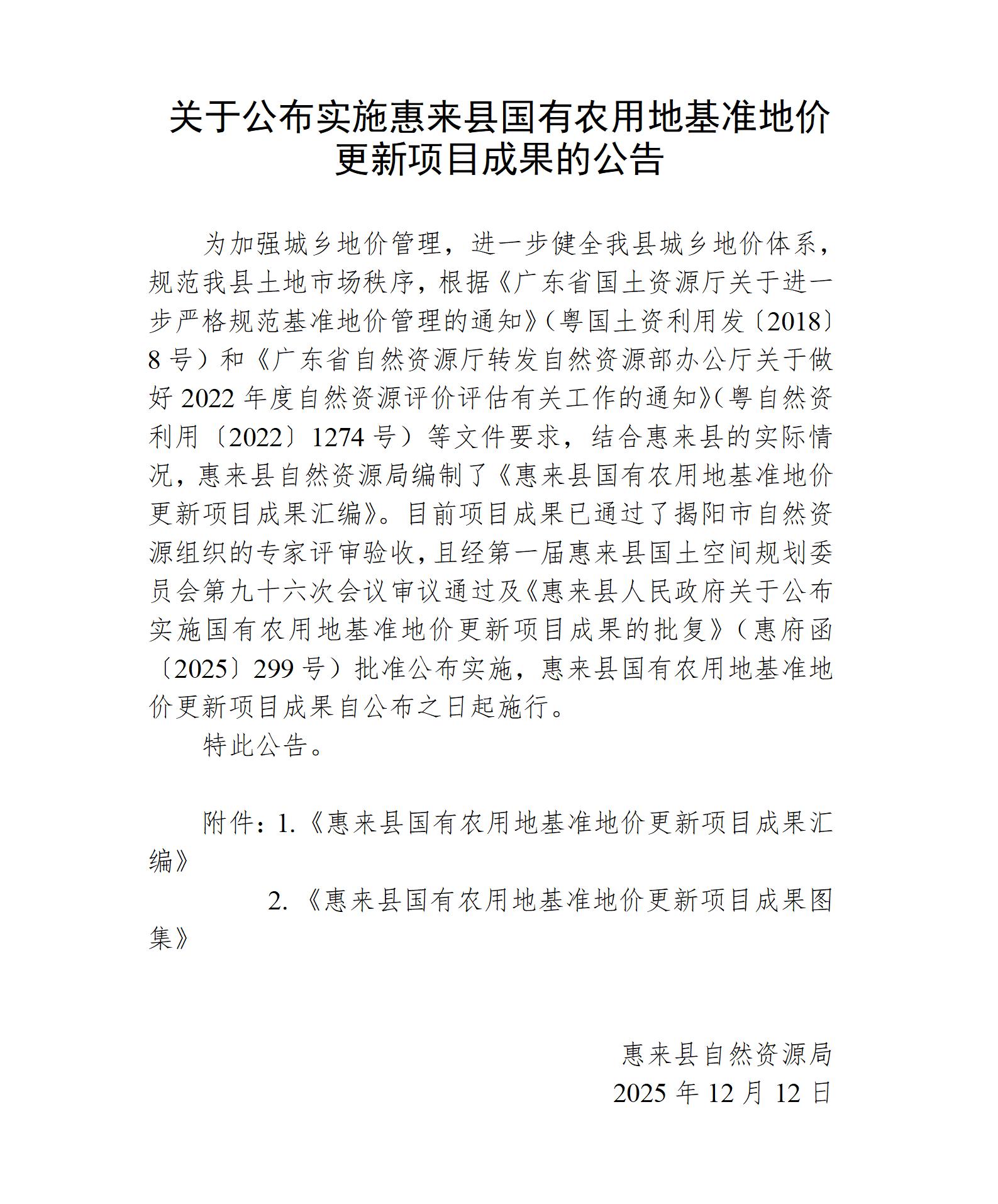 关于公布实施惠来县国有农用地基准地价更新项目成果的公告