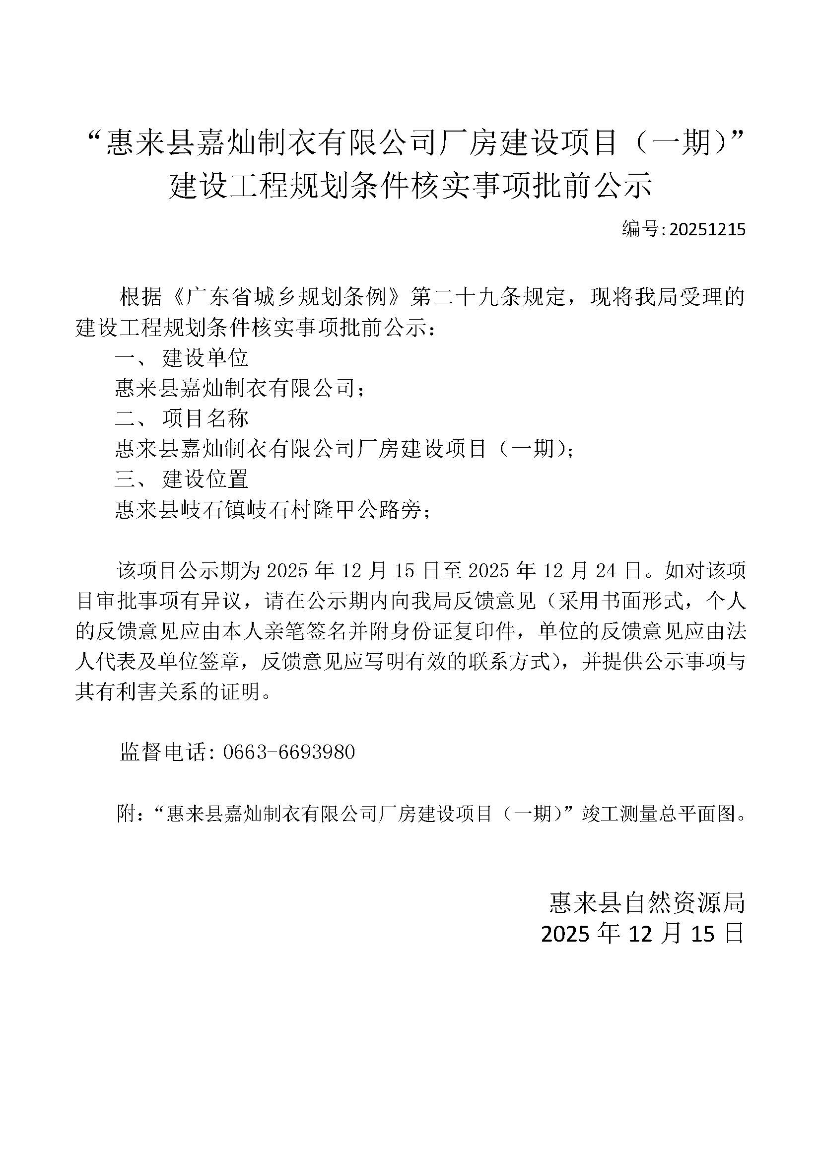 惠来县嘉灿制衣有限公司厂房建设项目(一期)建设工程规划条件核实批前公示