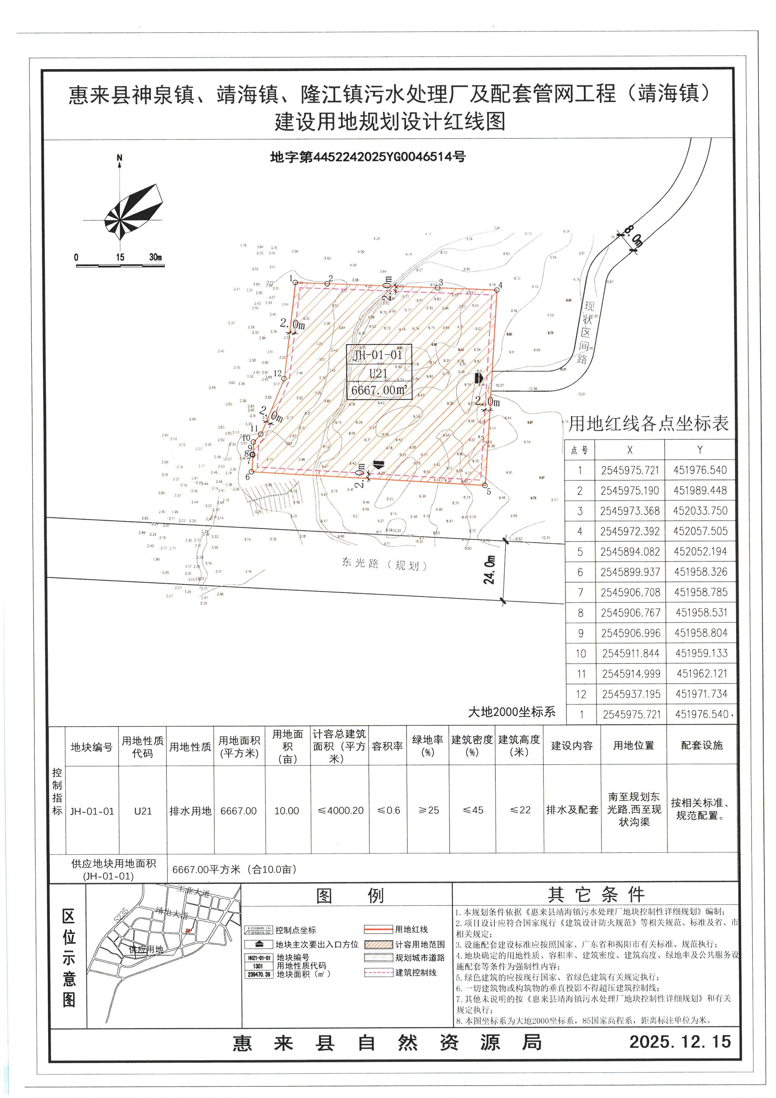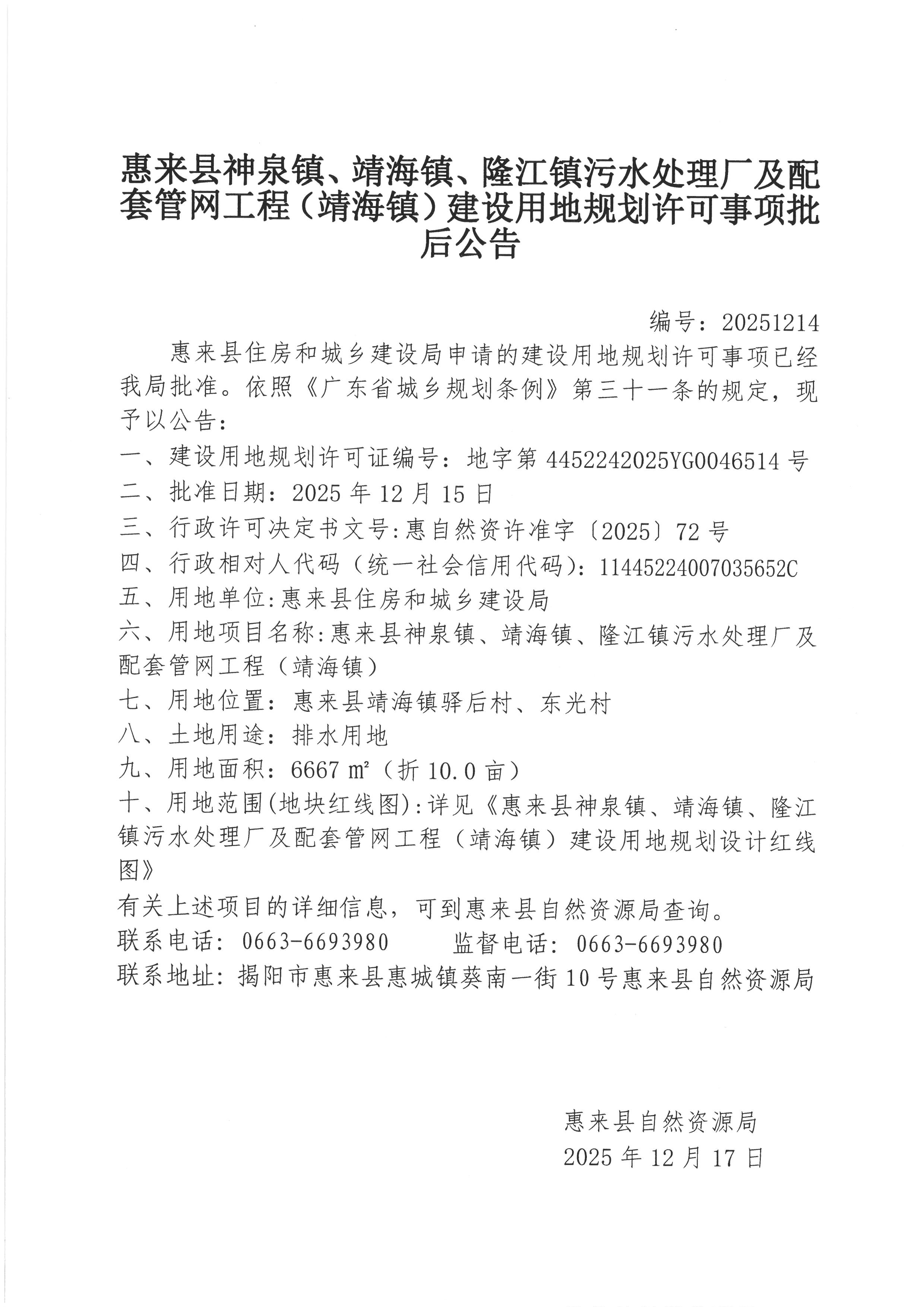 惠来县神泉镇、靖海镇、隆江镇污水处理厂及配套管网工程(靖海镇)建设用地规划许可事项批后公告