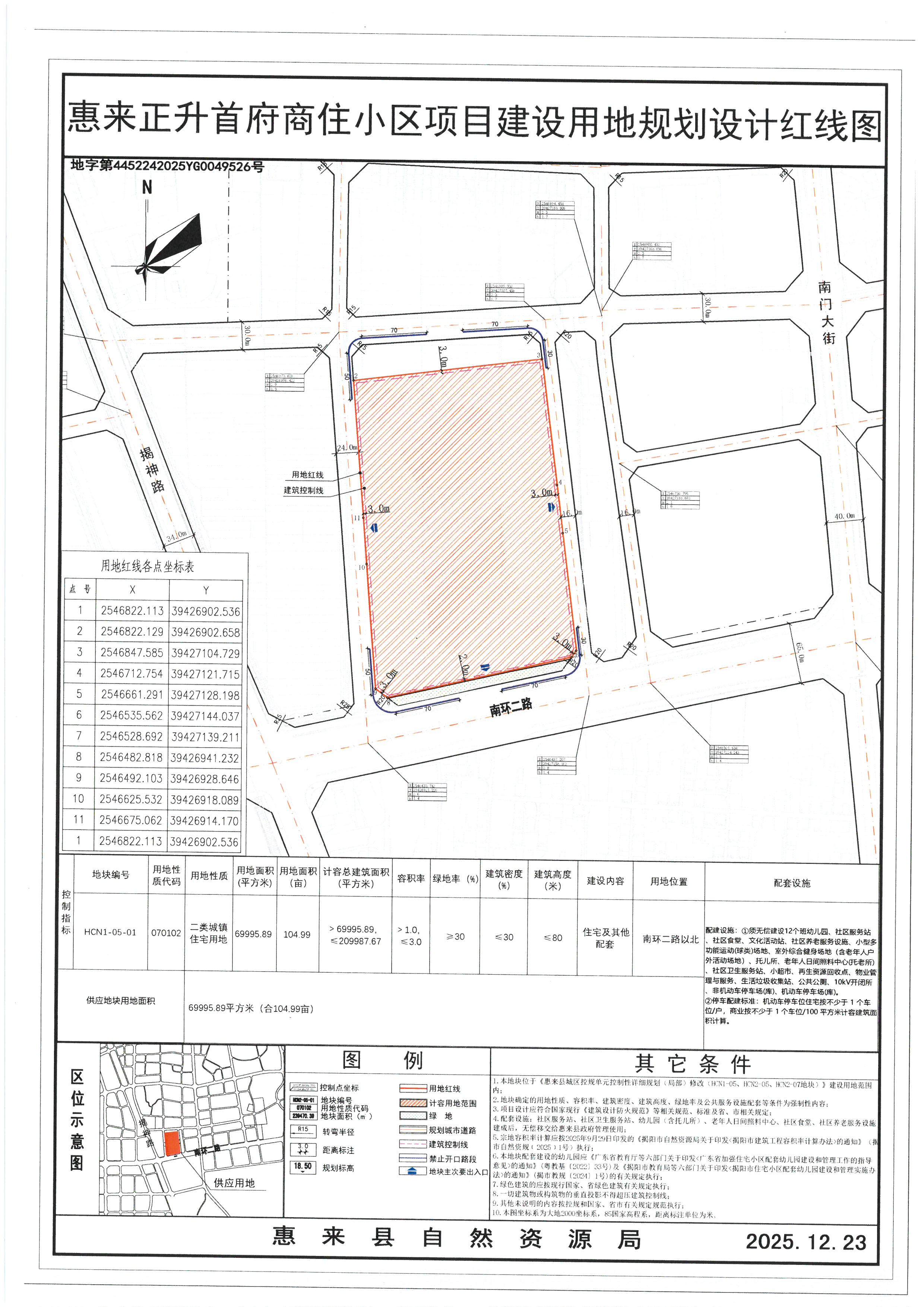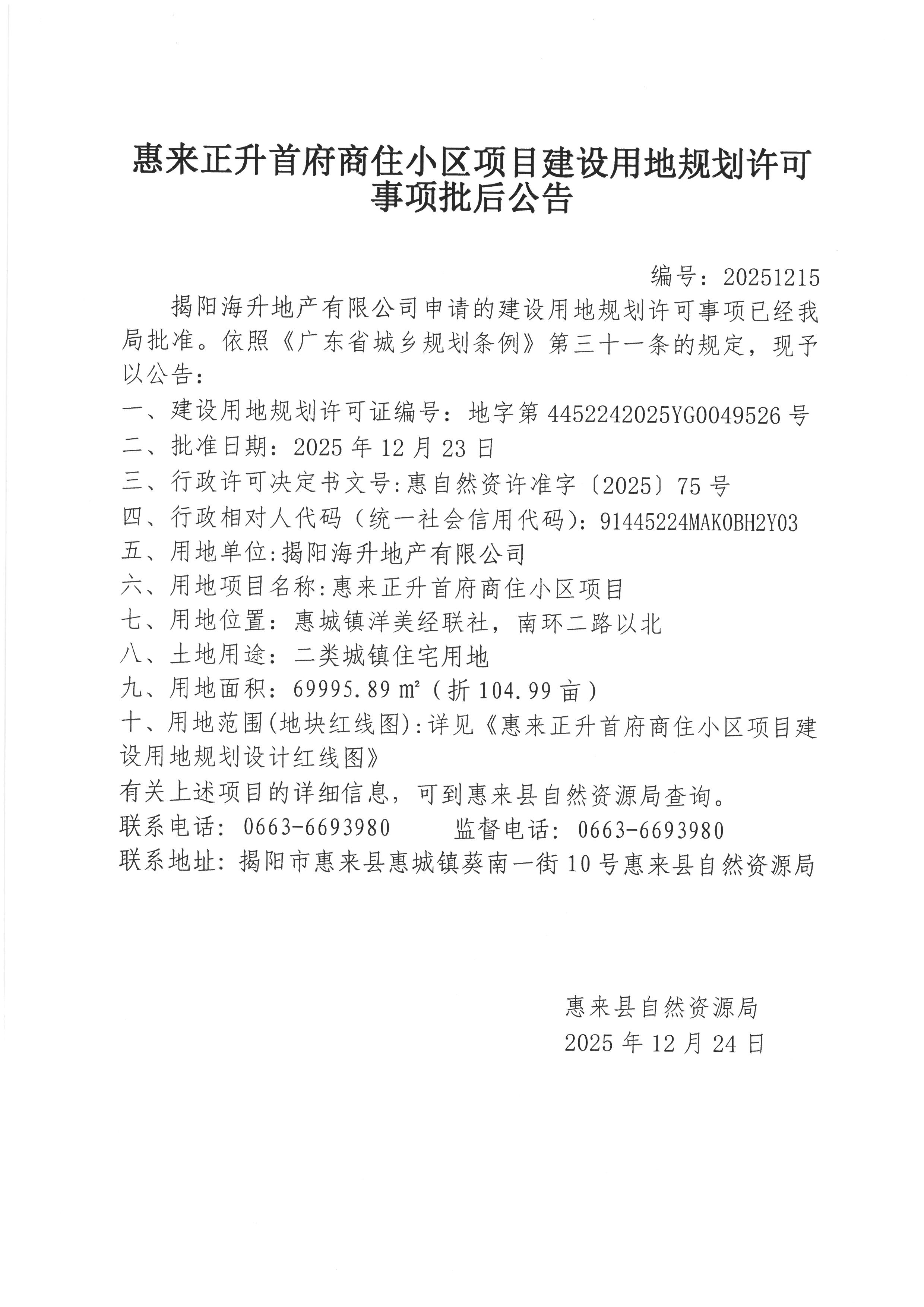 惠来正升首府商住小区项目建设用地规划许可事项批后公告