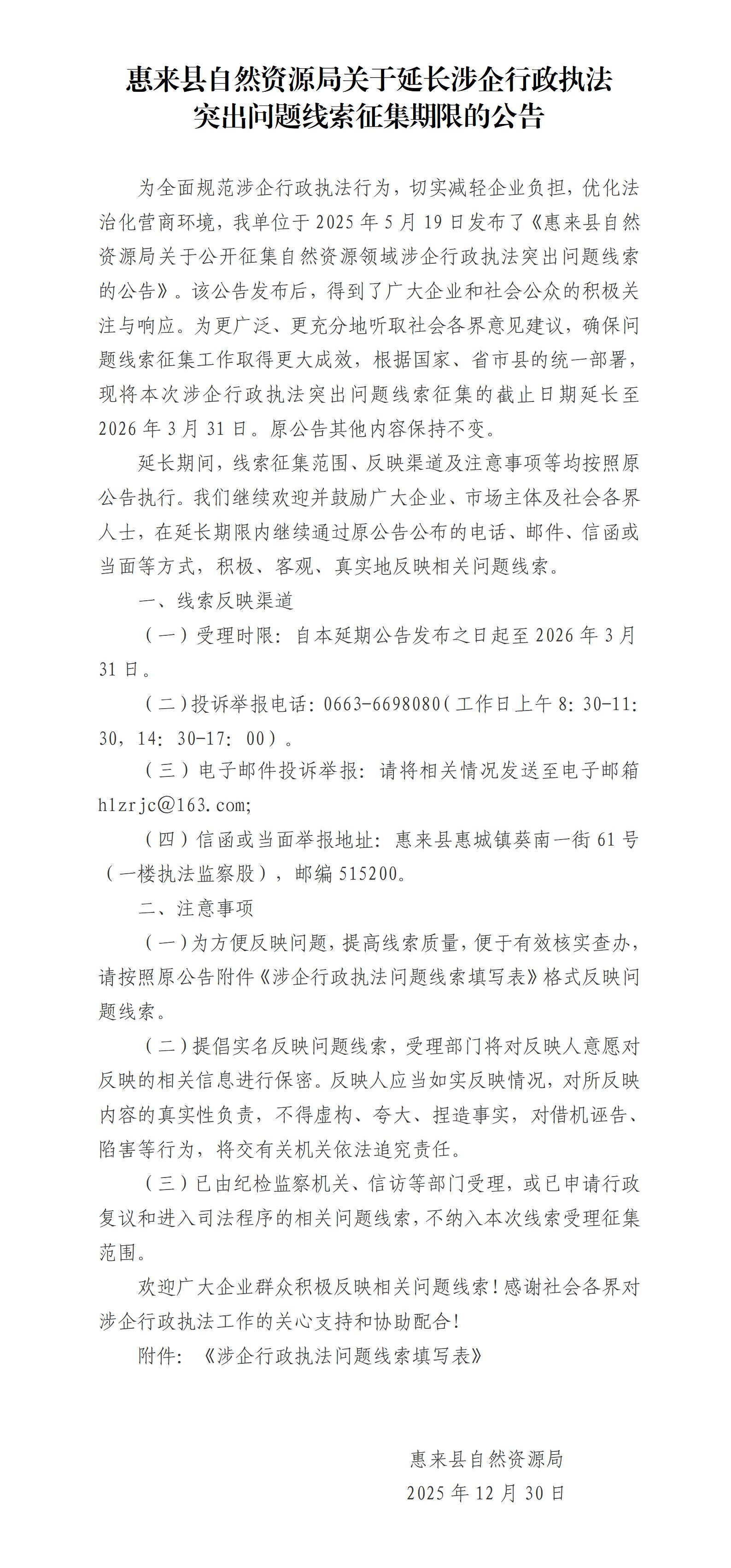 惠来县自然资源局关于延长涉企行政执法突出问题线索征集期限的公告