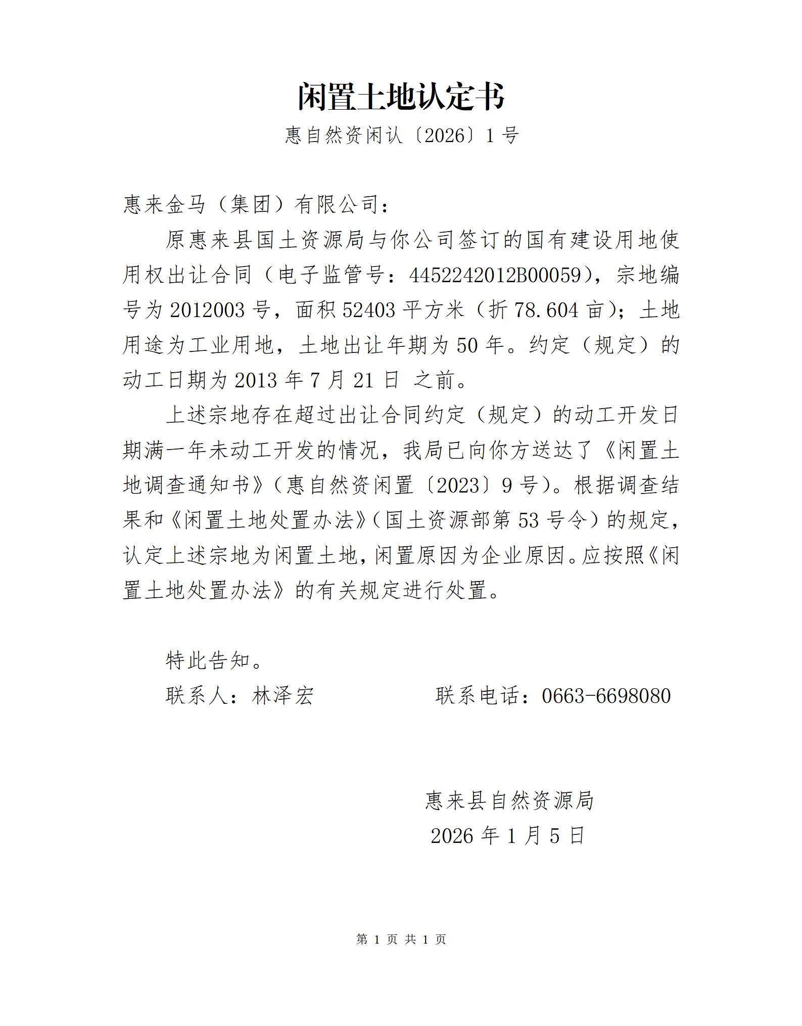 闲置土地认定书(惠自然资闲认〔2026〕1号)