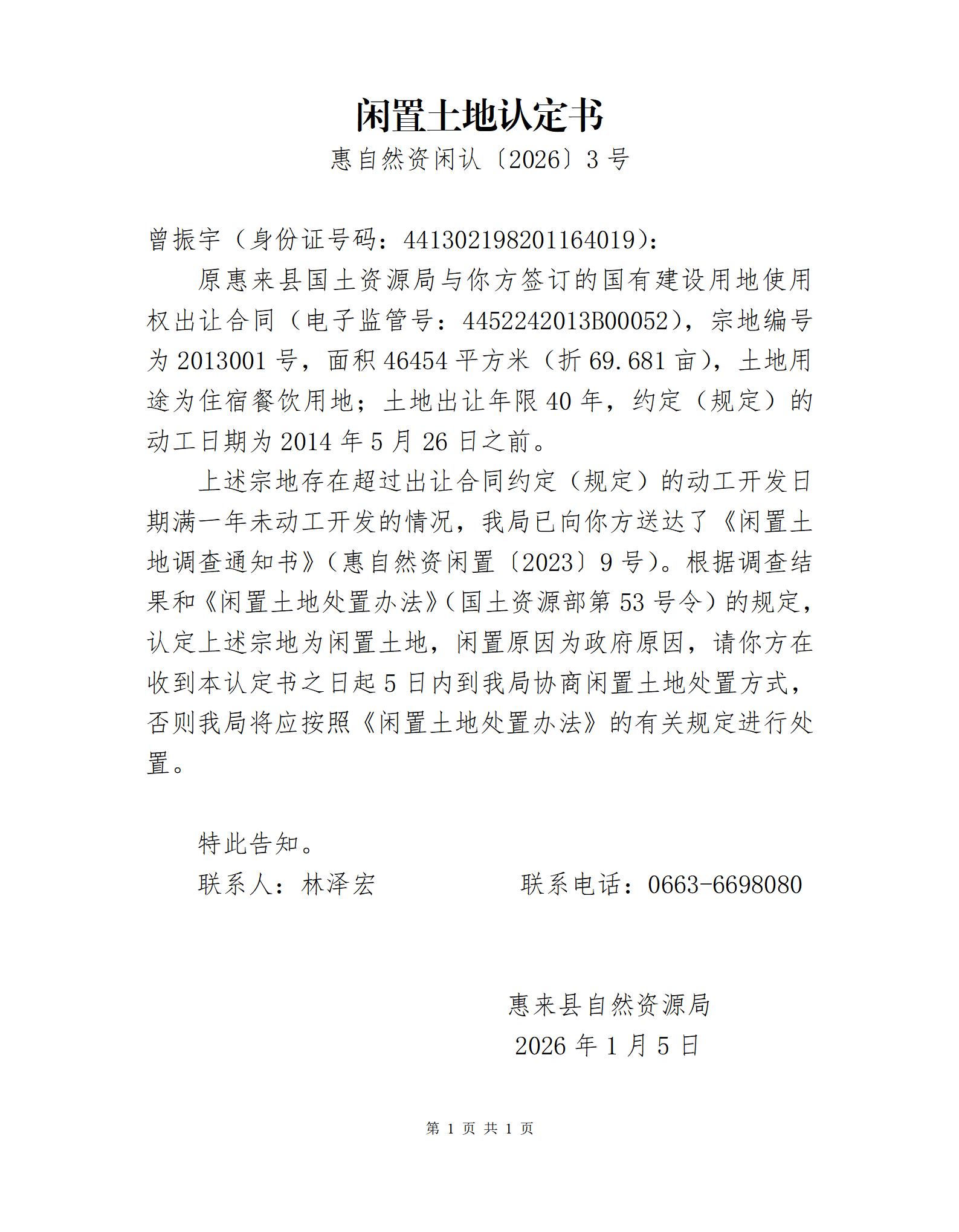 闲置土地认定书(惠自然资闲认〔2026〕3号)