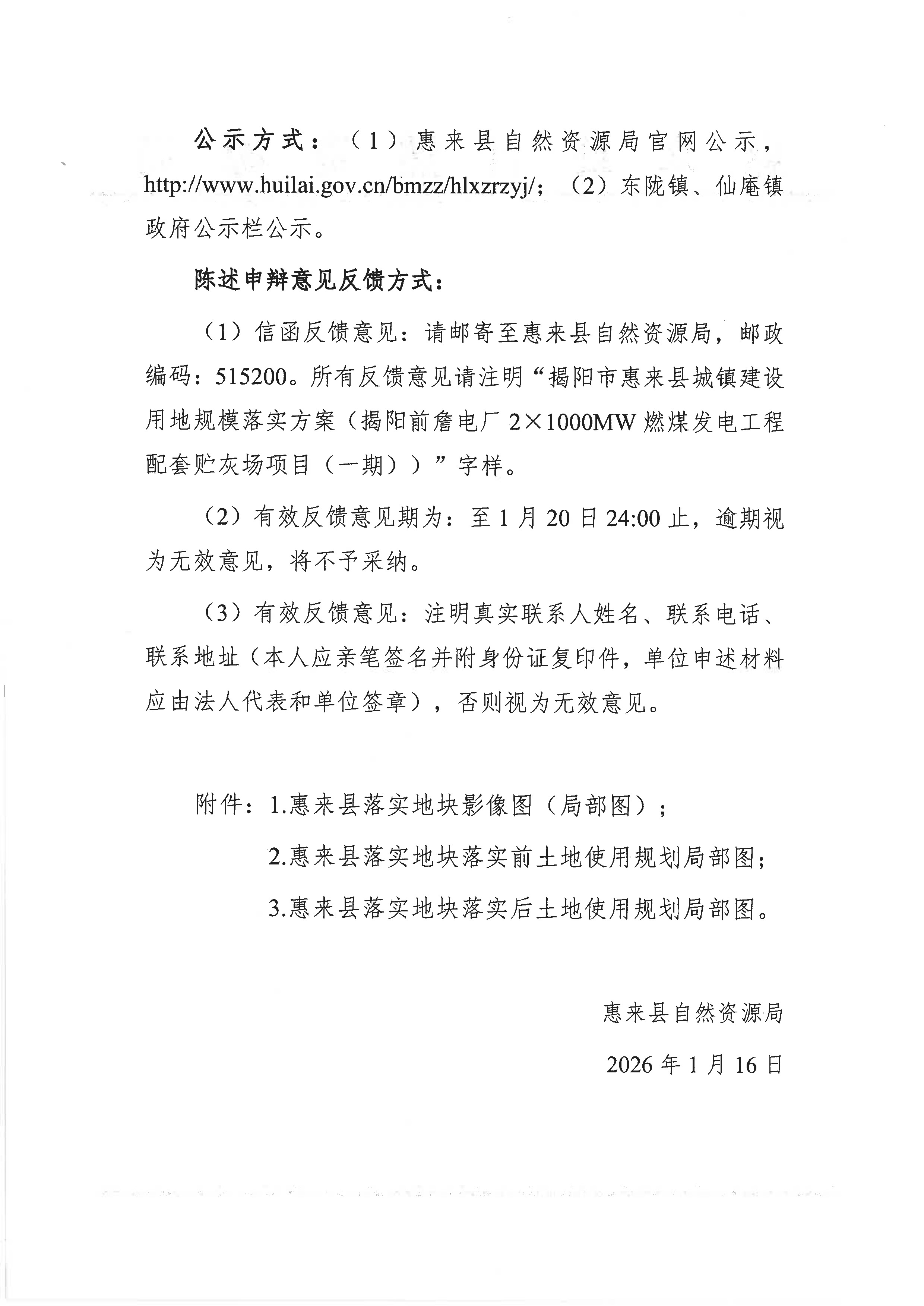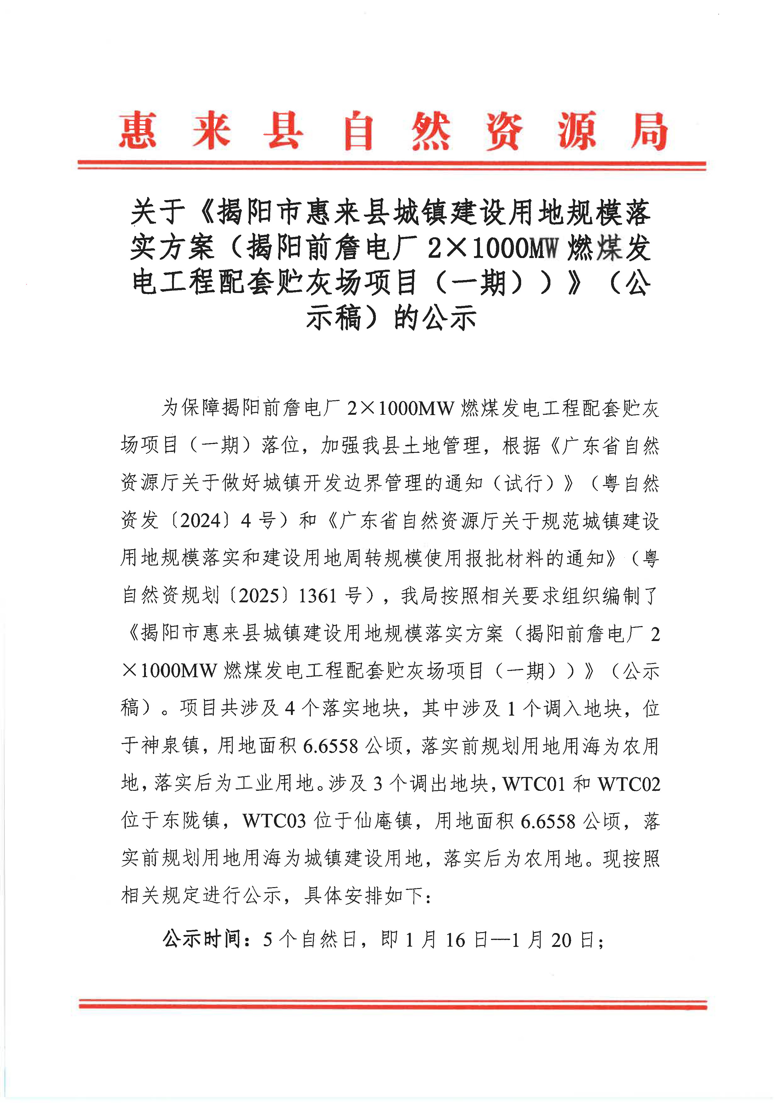 关于《揭阳市惠来县城镇建设用地规模落实方案(揭阳前詹电厂2×1000MW燃煤发电工程配套贮灰场项目(一期))》(公示稿)的公示