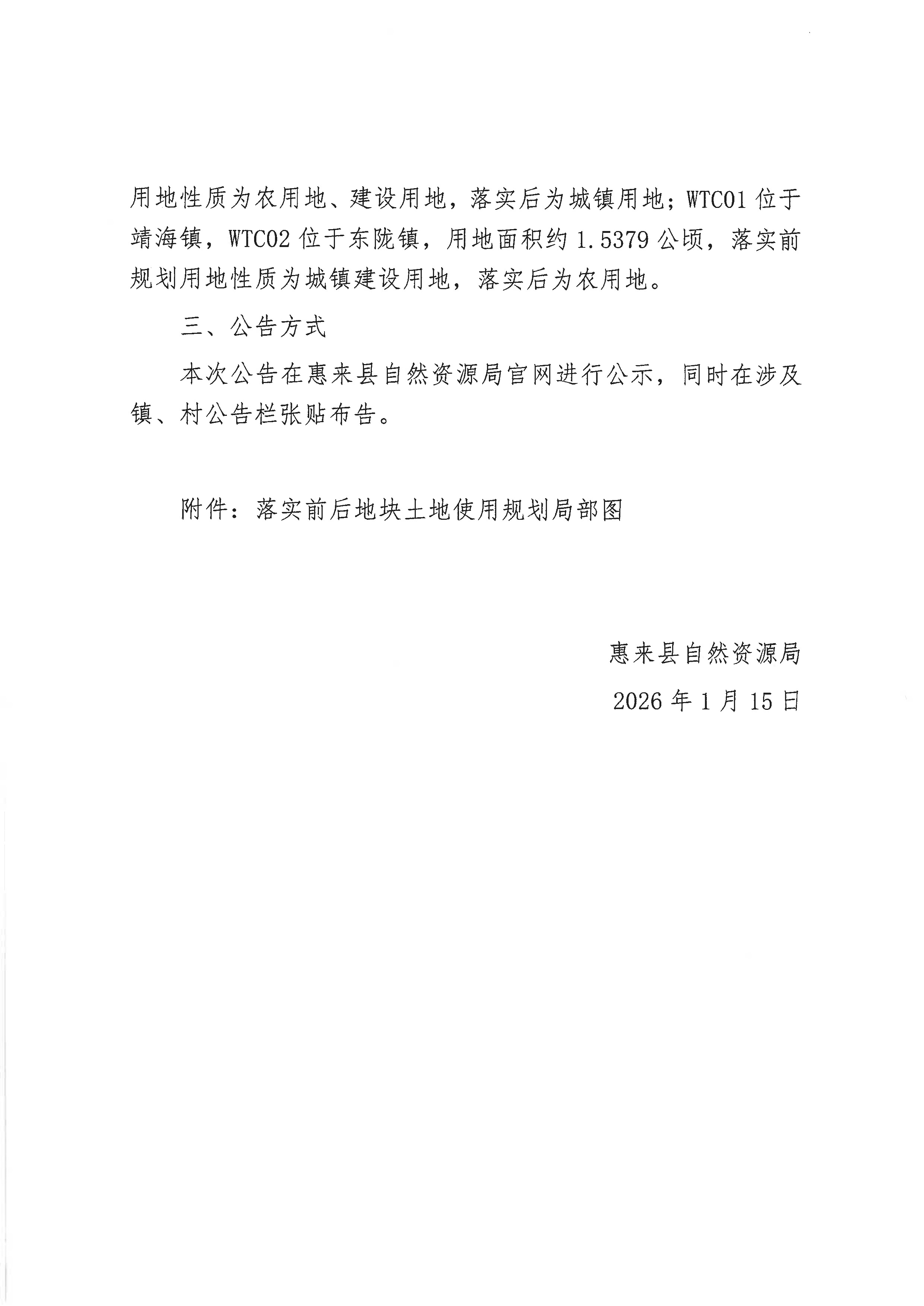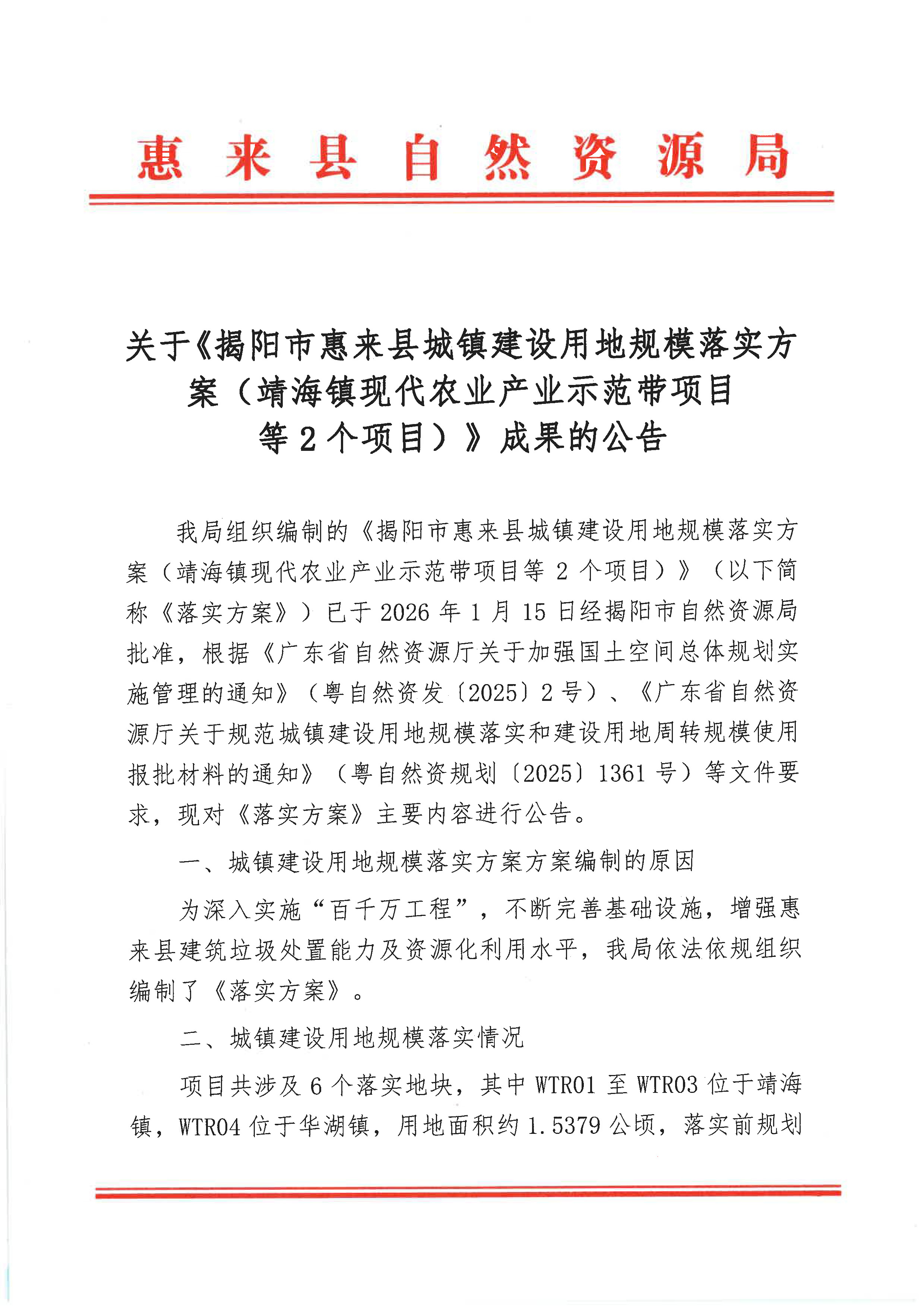 关于《揭阳市惠来县城镇建设用地规模落实方案(靖海镇现代农业产业示范带项目等2个项目)》成果的公告