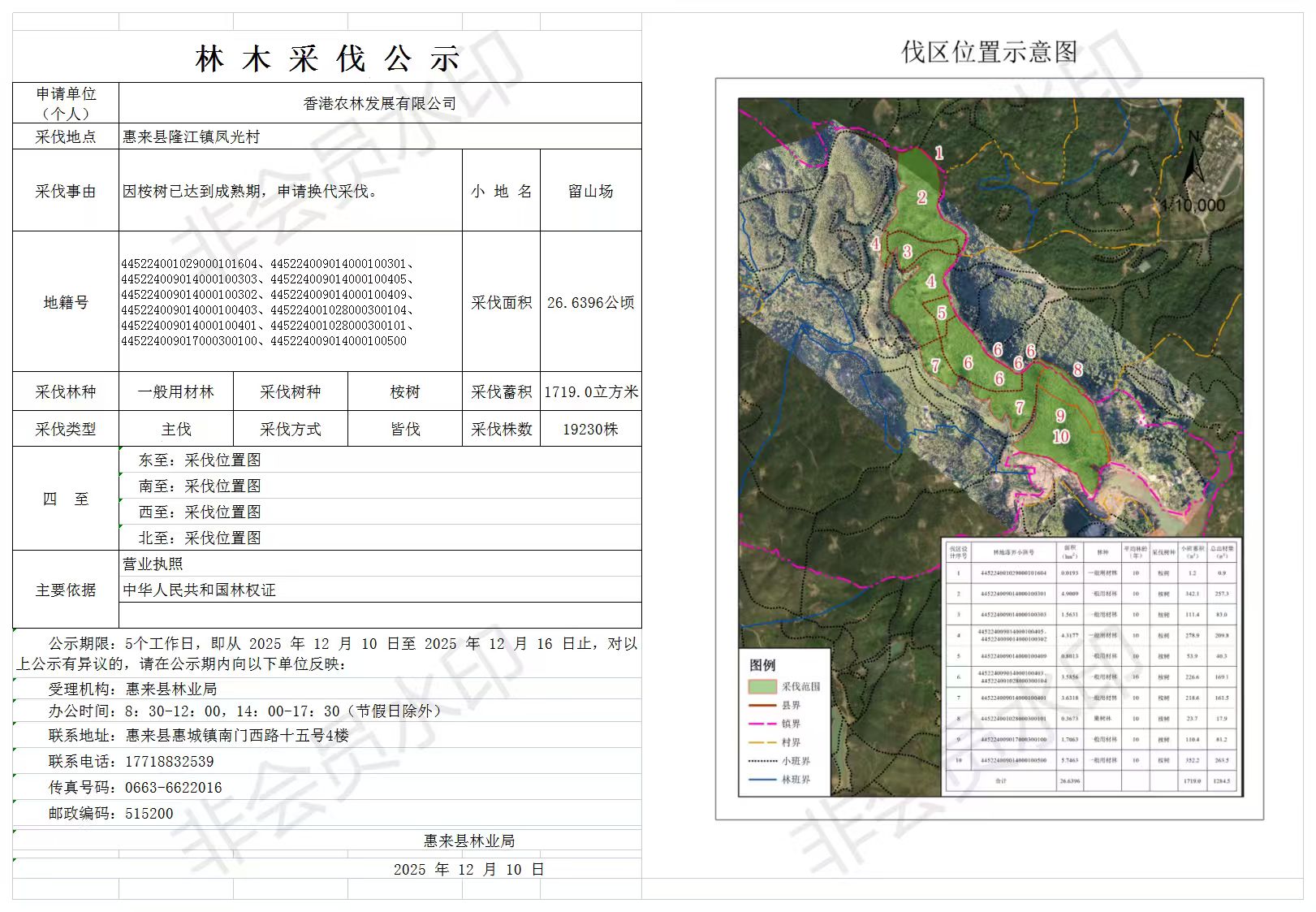 林木采伐公示 香港农林发展有限公司 惠来县隆江镇凤光村