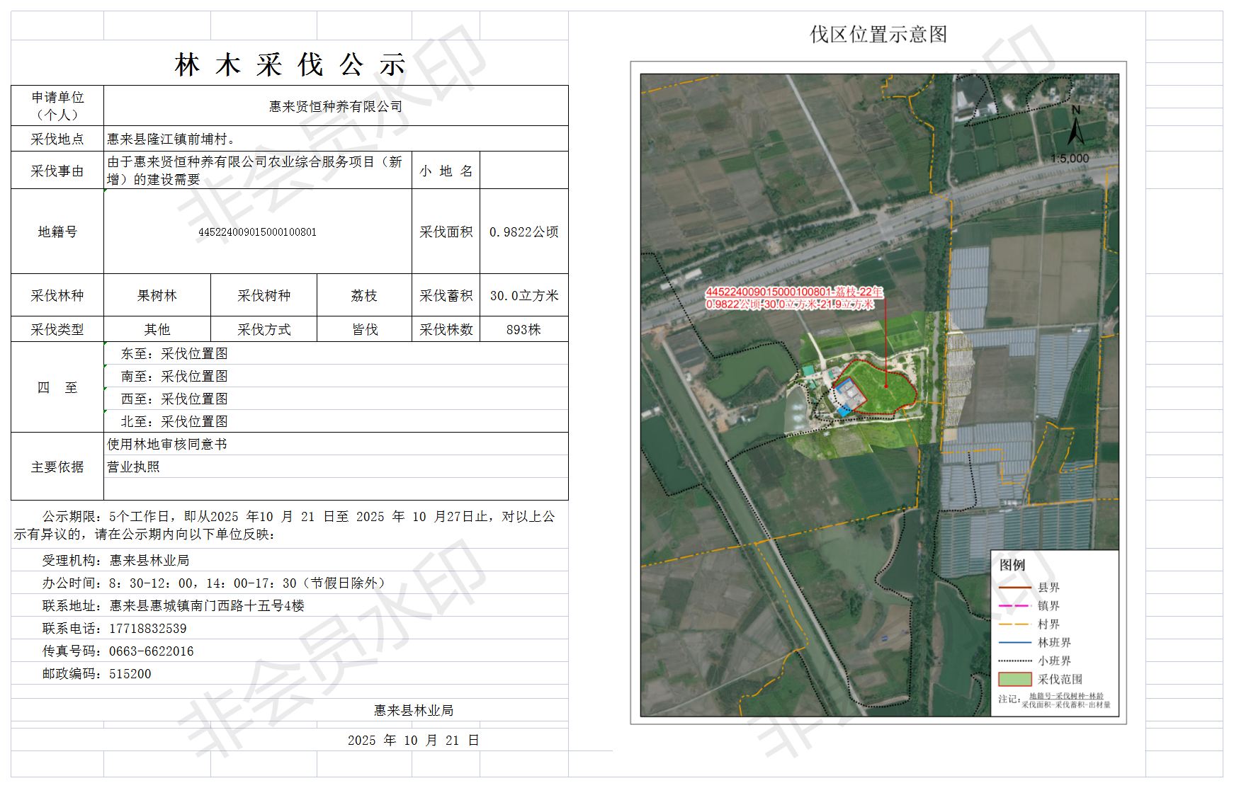林木采伐公示 惠来贤恒种养有限公司 惠来县隆江镇前埔村