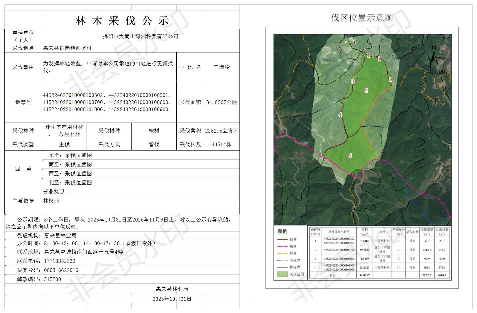林木采伐公示 揭阳市大南山绿洲种养有限公司 惠来县侨园镇西坑村 2