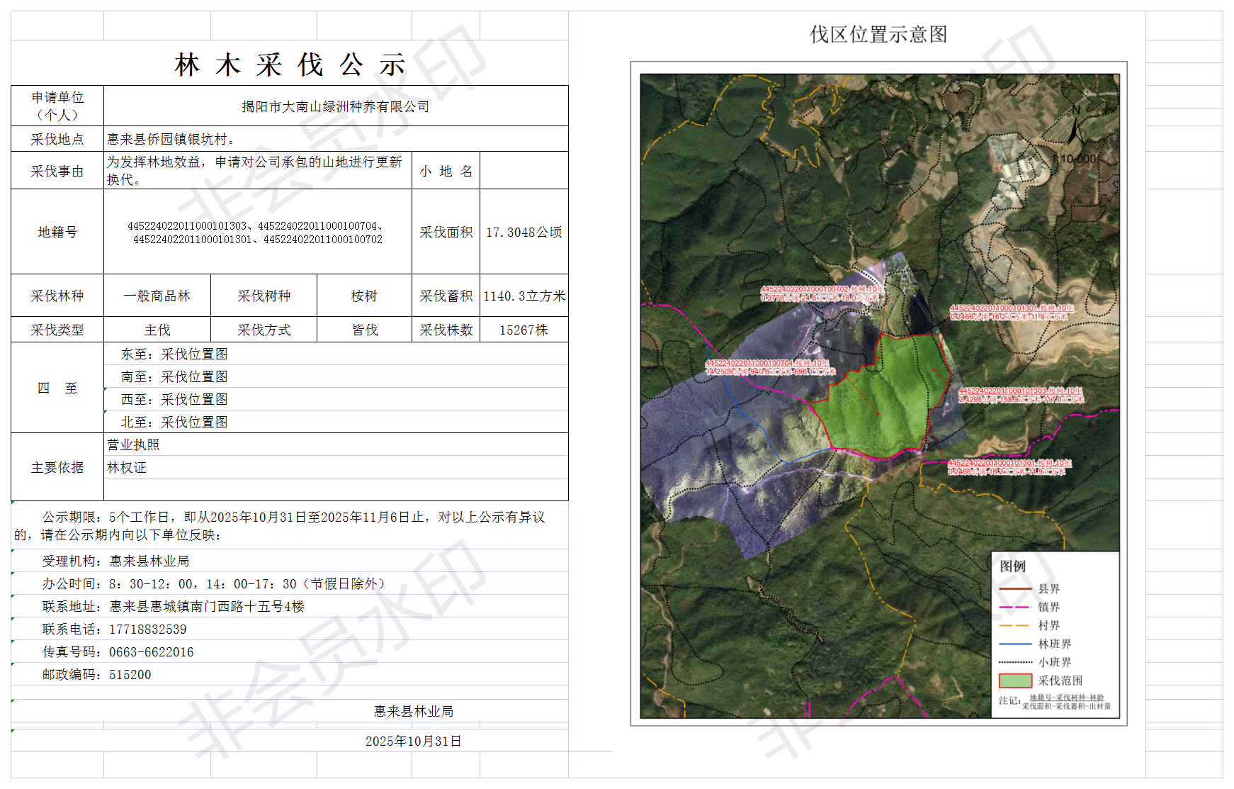 林木采伐公示 揭阳市大南山绿洲种养有限公司 惠来县侨园镇西坑村