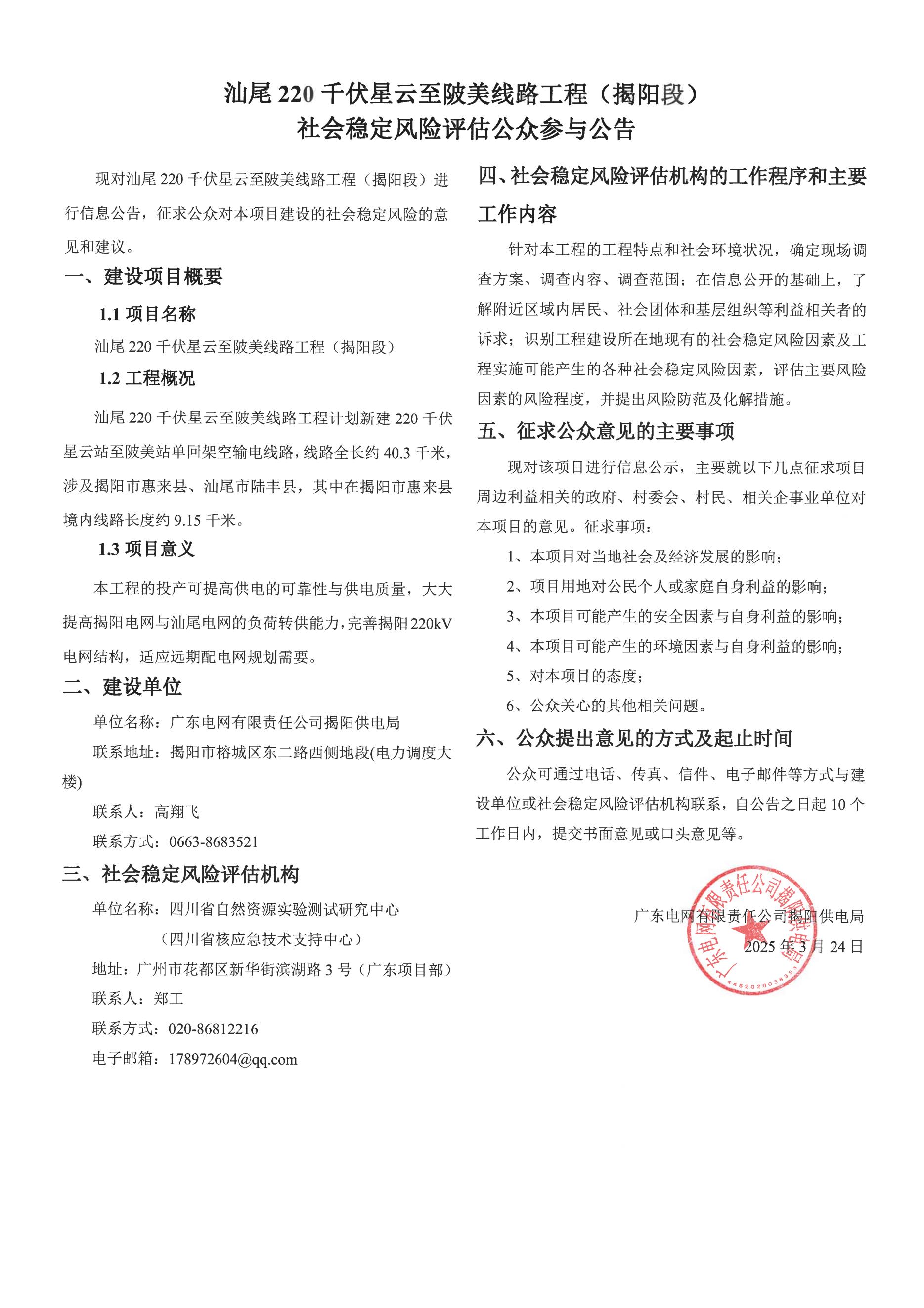汕尾 220千伏星云至陂美线路工程(揭阳段)社会稳定风险评估公众参与公告