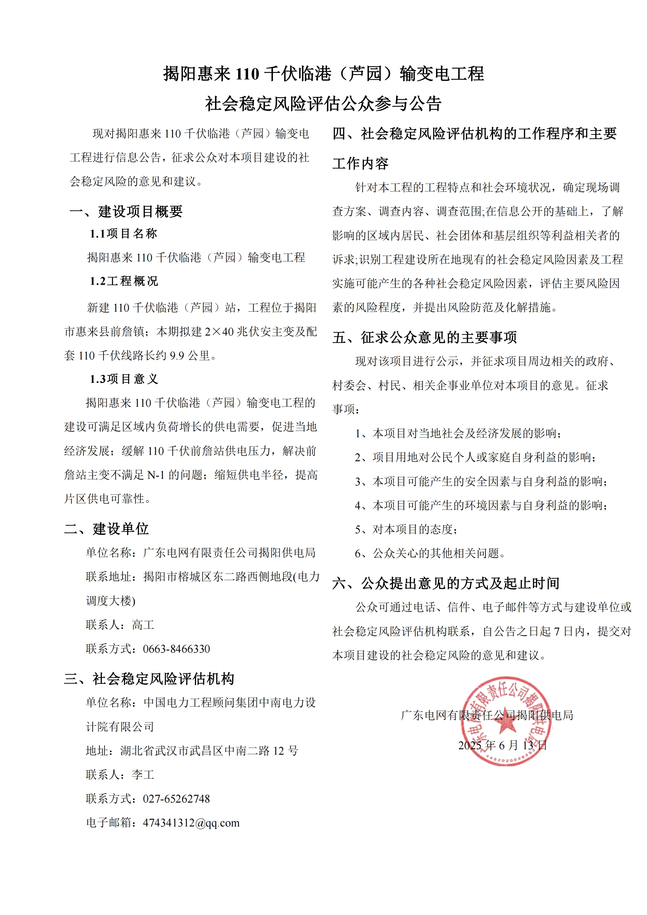 揭阳惠来 110千伏临港(芦园)输变电工程社会稳定风险评估公众参与公告