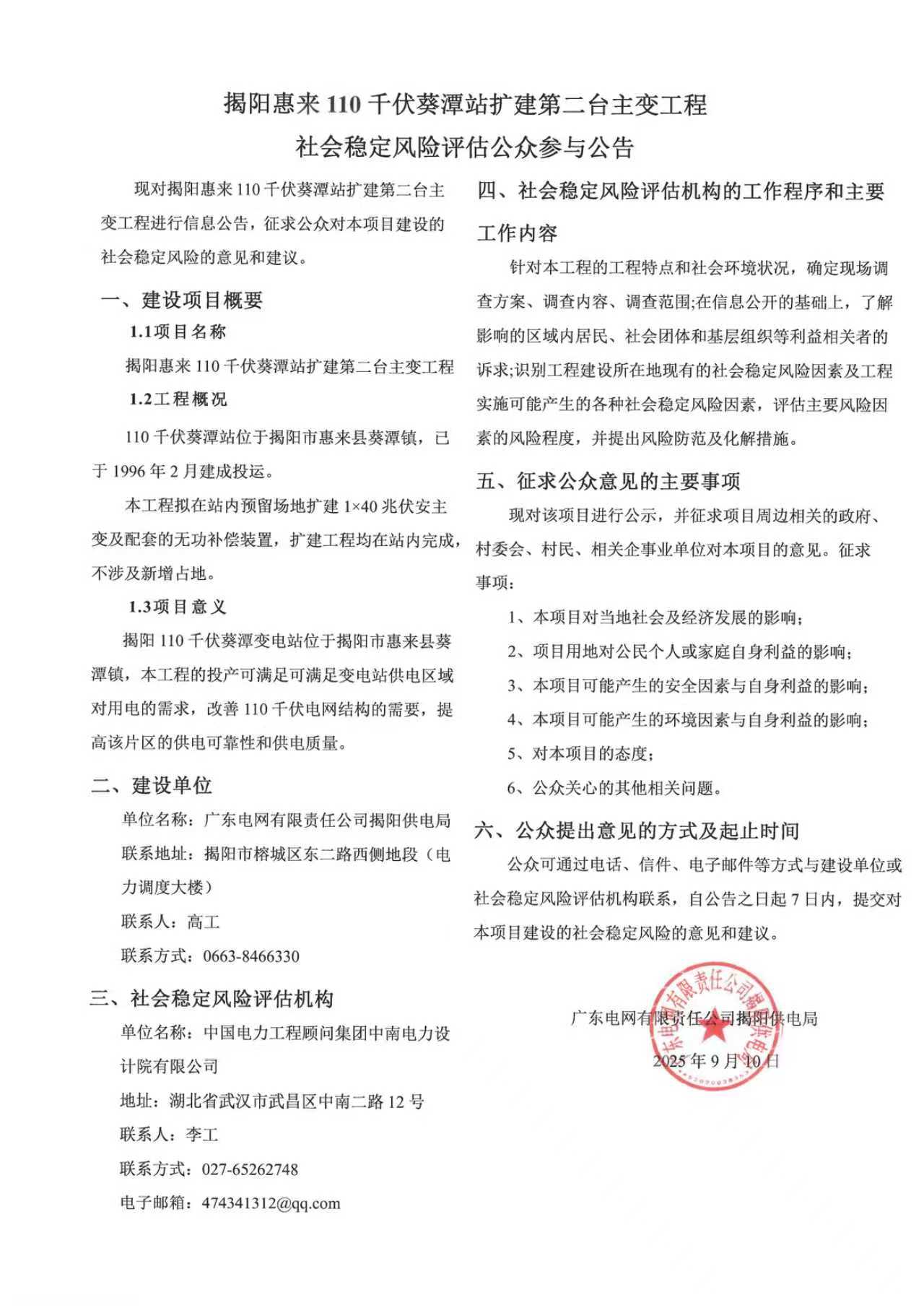 揭阳惠来110千伏葵潭站扩建第二台主变工程社会稳定风险评估公众参与公告