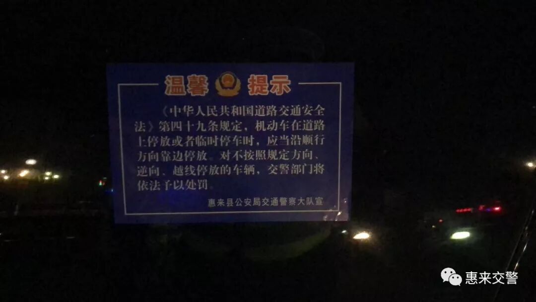 环卫工人不容易,你的安全我们来守护 除夕夜,交警惠城中队在巡逻过程,发现一名环卫工人在公路中间“睡着了”,巡逻民警立即上前查看情况,原来环卫大叔是太累,休息了一下,民警护着环卫大叔离开公路,到路边休息。简单的交 机动车乱停乱放不可取,交警温馨提示要牢记 春节期间,多部门联合发文,设置免费停车场5处,仍有部分车主心存侥幸和图方便,将机动车乱停乱放,惠来交警以温馨提示代替处罚单,呼吁广大驾驶员自觉遵守交通法规,在没有停车位的情况下,将车辆停放在梅北小学、墩南小学、祚通小学、实验小学东郊校区、西联小学。 交通事故造拥堵,及时调解化矛盾 除夕夜,交警惠城中队接到一宗剐蹭的交通事故警情,因多方面原因双方无法达成和解,造成路面拥堵严重。值班领导胡伟东立即到达现场,多方调节,和派出所民警一起化解了一起由交通事故引起的矛盾。在双方撤离现场,道路疏导恢复秩序后,留下的是交通警察在公路中间坚守的背影。这,就是交通警察工作的缩影,看似平凡而又不平凡的岗位。 除夕夜,保畅通的有城区的他们,乡镇的他们,巡逻的他们,他们的名字是“交通警察”,为了节假日道路畅通、安全,默默付出,舍小家为大家。