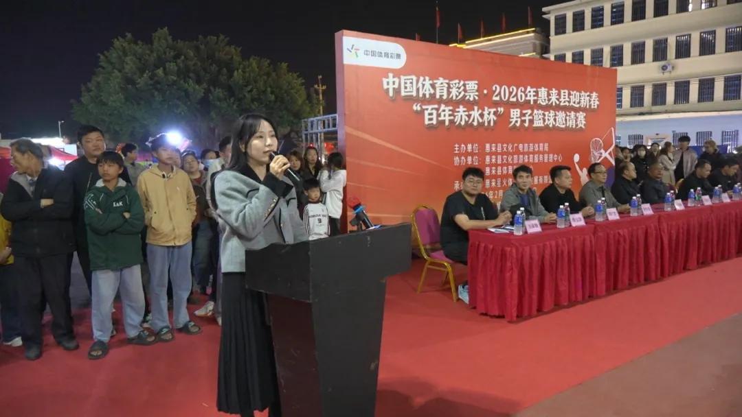 为丰富节日群众精神文化生活,展示城市活力,2月4日晚,由县文化广电旅游体育局主办,惠来县星火体育文化发展有限公司承办的2026年惠来县迎新春“百年赤水杯”男子篮球邀请赛在县人民广场火热开幕。县文化广电旅游体育局局长王冠敏参加开幕式。