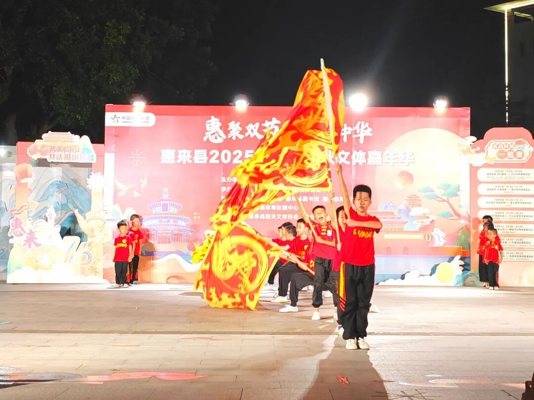 形式多样的少儿文体节目生动诠释了“少年强则国强,少年智则国智”的深刻内涵,尽管斜风细雨拂面,现场观众的热情丝毫未减,大家纷纷为惠来少儿风雨无阻、从容不迫的出色表现点赞。此次展演不仅集中展现了惠来少年儿童活力满满、德智体美劳全面发展的良好风貌,更通过一个个鲜活的节目,传递 出孩子们对祖国的深情祝福与对未来的美好憧憬,为国庆佳节增添了浓厚的文化气息