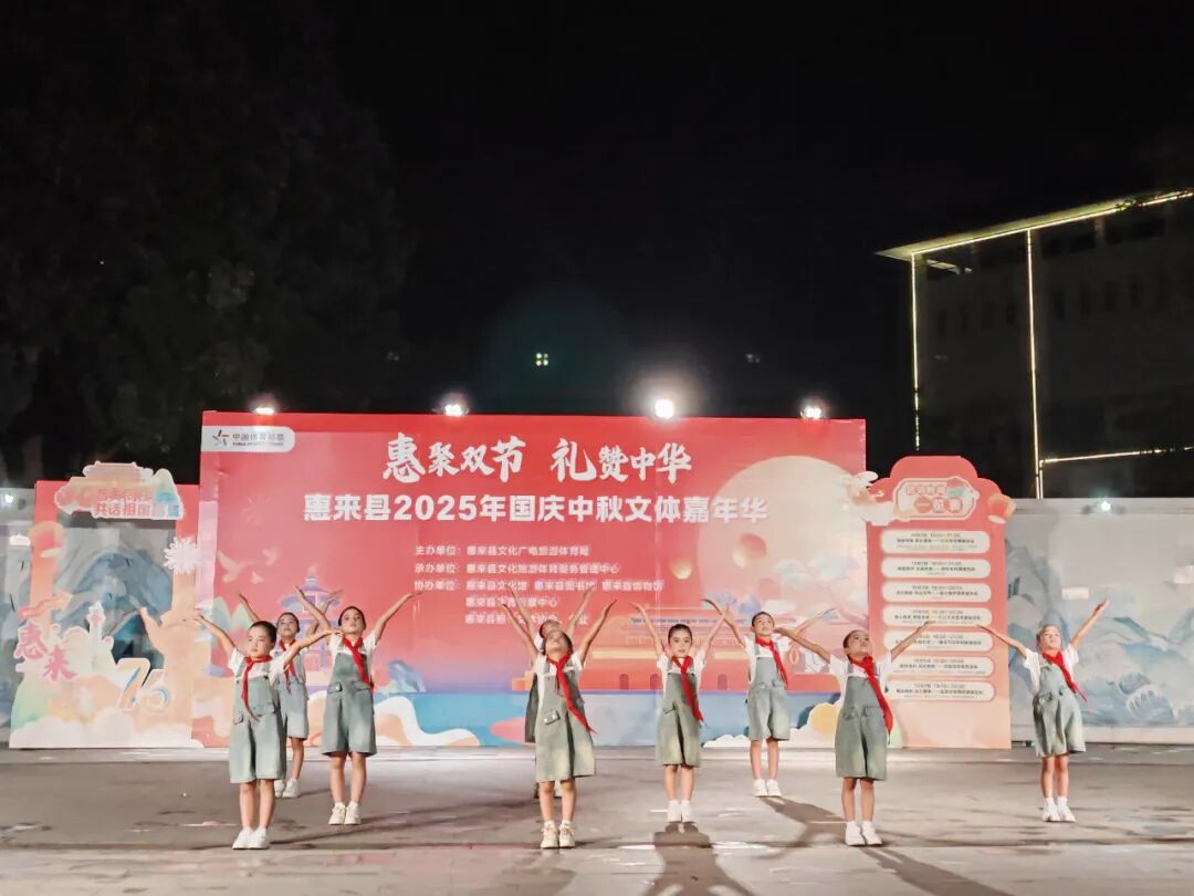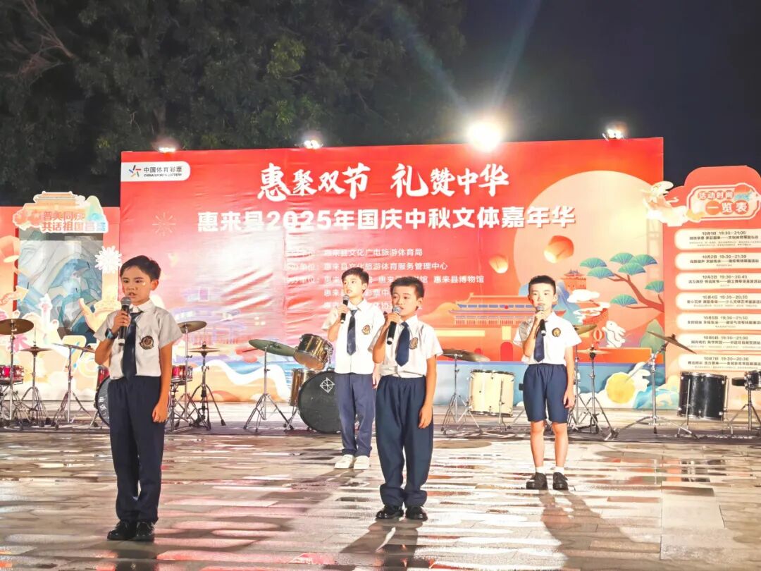 形式多样的少儿文体节目生动诠释了“少年强则国强,少年智则国智”的深刻内涵,尽管斜风细雨拂面,现场观众的热情丝毫未减,大家纷纷为惠来少儿风雨无阻、从容不迫的出色表现点赞。此次展演不仅集中展现了惠来少年儿童活力满满、德智体美劳全面发展的良好风貌,更通过一个个鲜活的节目,传递 出孩子们对祖国的深情祝福与对未来的美好憧憬,为国庆佳节增添了浓厚的文化气息