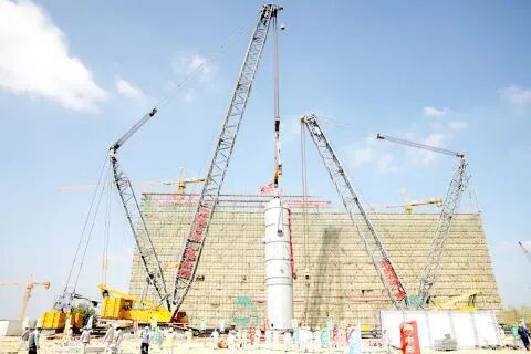 这是中石油广东石化炼化一体化项目石油焦制氢装置第一台碳洗塔。该设备吊装作业首战告捷,标志着全项目正式迈入大型设备一体化吊装、安装新阶段。截至11月28日,石油焦制氢装置剩余的5台碳洗塔也全部完成吊装。